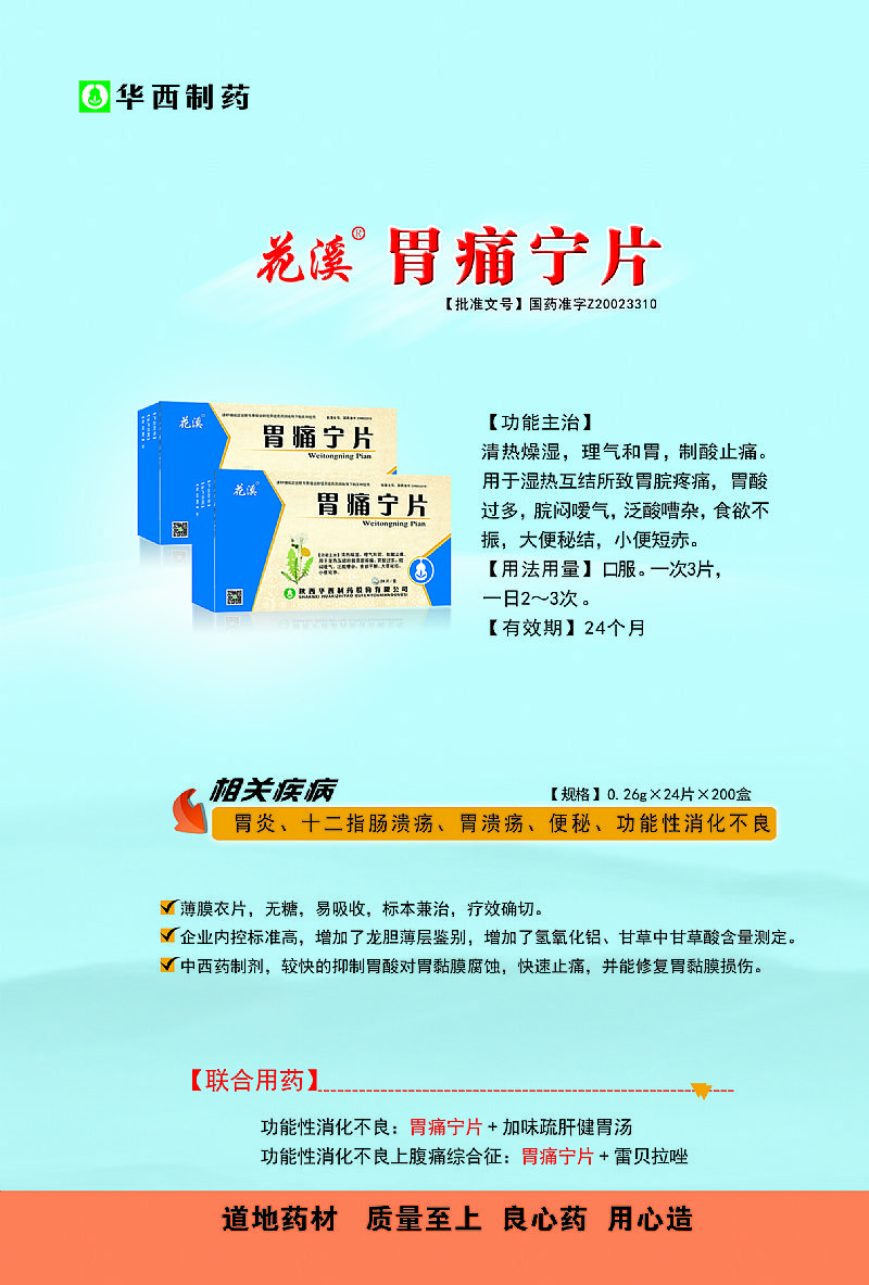 | 功能主治 | 功效/作用:胃痛寧片具有清熱燥濕,理氣和胃,制酸止痛的作用。 效果:胃痛寧片針對于由濕熱互結(jié)所致胃脘疼痛,胃酸過多,脘悶噯氣,泛酸嘈雜,食欲不振,大便秘結(jié),小便短赤等癥狀具有良好的效果。 價格:目前市面上由陜西華西制藥股份有限公司生產(chǎn)的胃痛寧片,其中24片裝市場價格為19元每盒,36片裝為28元每盒。詳細的代理價格與政策可通過下方聯(lián)系方式同廠家取得聯(lián)系,亦或可通過下方留言板給我們留言。 |