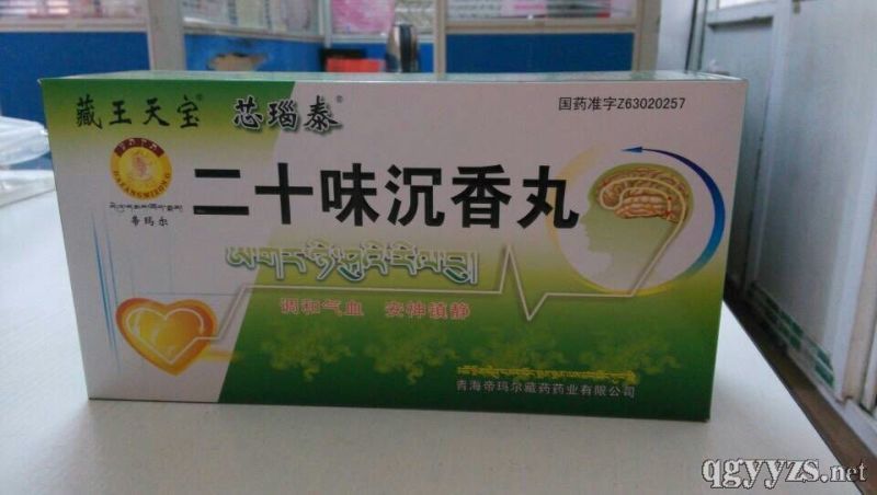 | 主要成分 | 沉香、丁香、木瓜、肉豆蔻、藏紅花、木香、石灰華、兔心、高良姜、木棉花、草果、石榴、訶子、珍珠母、牛黃、藏菖蒲、乳香、甘露“曲曼”、紫硵砂、馬錢子(制)、鹿角等二十味。 |