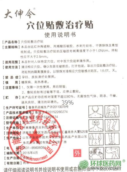 | 使用方法 | 清潔相應(yīng)穴位,確認(rèn)包裝物破損后,打開包裝,取出穴位貼服治療貼,將貼劑的隔離膜撕去,以鋼珠對準(zhǔn)相應(yīng)穴位敏感點(diǎn)貼壓,1片/穴、天。 |