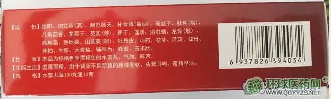 | 主要成分 | 鎖陽、肉蓯蓉(蒸)、制巴戟天、補骨脂(鹽炒)、菟絲子、杜仲(炭)、八角茴香、韭菜子、芡實(炒)、蓮子、蓮須、煅牡蠣、龍骨(煆)、鹿角霜、熟地黃、山茱萸(制)、牡丹皮、山藥、茯苓、澤瀉、知母、黃柏、牛膝、大青鹽。輔料為:蜜蜂、玉米朊。 |