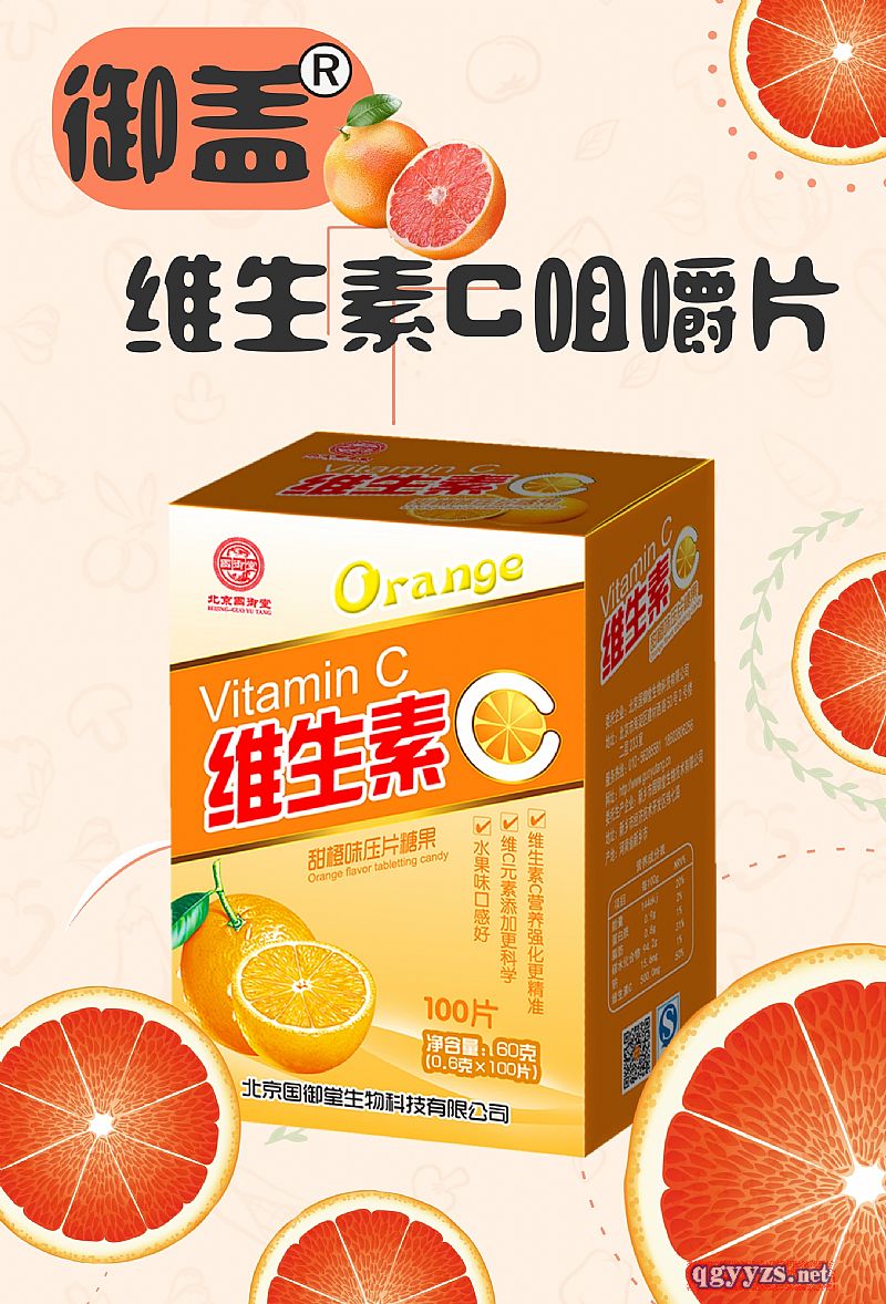 [商品名稱] 御蓋維生素C咀嚼片 [生產(chǎn)] 新鄉(xiāng)市國御堂生物技術(shù)有限公司 [規(guī)格]0.5gX100片 200盒/件 [儲(chǔ)藏方法]密封、置陰涼干燥處 [注意事項(xiàng)]本品不能代替藥物 |