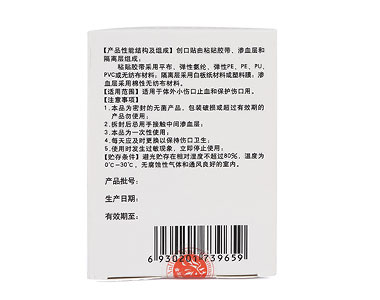 | 補(bǔ)充說明 | 優(yōu)勢:創(chuàng)可貼能夠壓迫止血、保護(hù)創(chuàng)面、預(yù)防感染、促進(jìn)愈合,同時,又具有體積小、使用簡單、攜帶方便等優(yōu)點。 注意事項 本品為密封的無菌產(chǎn)品,包裝破損或超過有效期的產(chǎn)品勿使用。 拆封后忌用手接觸中間滲血期。 |