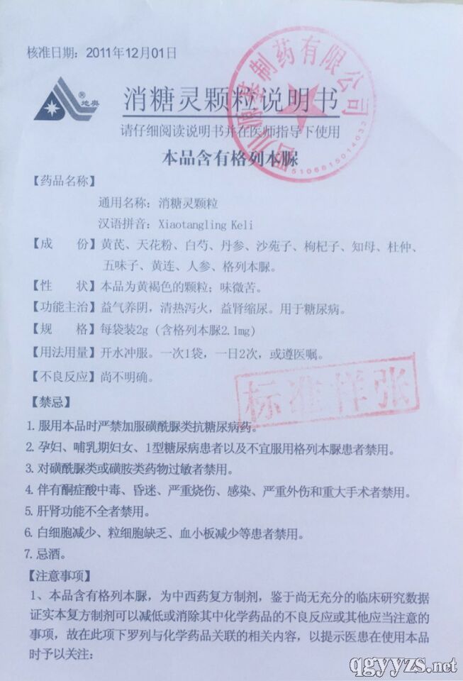| 補充說明 | 黃芪、天花粉、白芍、丹參、沙苑子、知母、杜仲、五味子、黃連、人參、格列本脲 本品為黃褐色顆粒,味微苦。 |