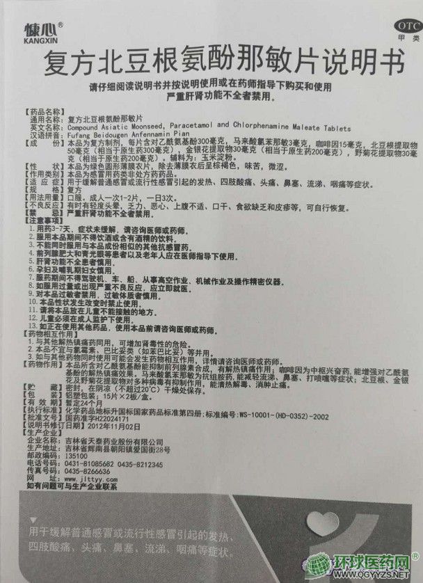| 主要成分 | 本品為復(fù)方制劑,每片含對(duì)乙酰氨基酚300毫克,馬來(lái)酸氯苯那敏3毫克,咖啡因15毫克,北豆根提取物50毫克(相當(dāng)于原生藥300毫克),金銀花提取物30毫克(相當(dāng)于原生藥200毫克),野菊花提取物30毫克(相當(dāng)于原生藥200毫克)。 |