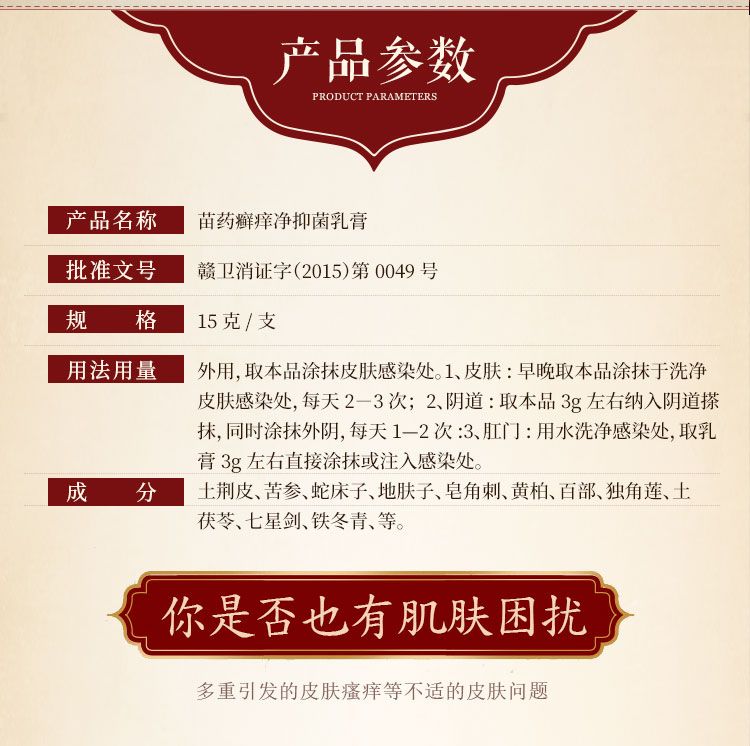 | 產(chǎn)品名稱 | 苗藥癬癢凈抑菌乳膏 |