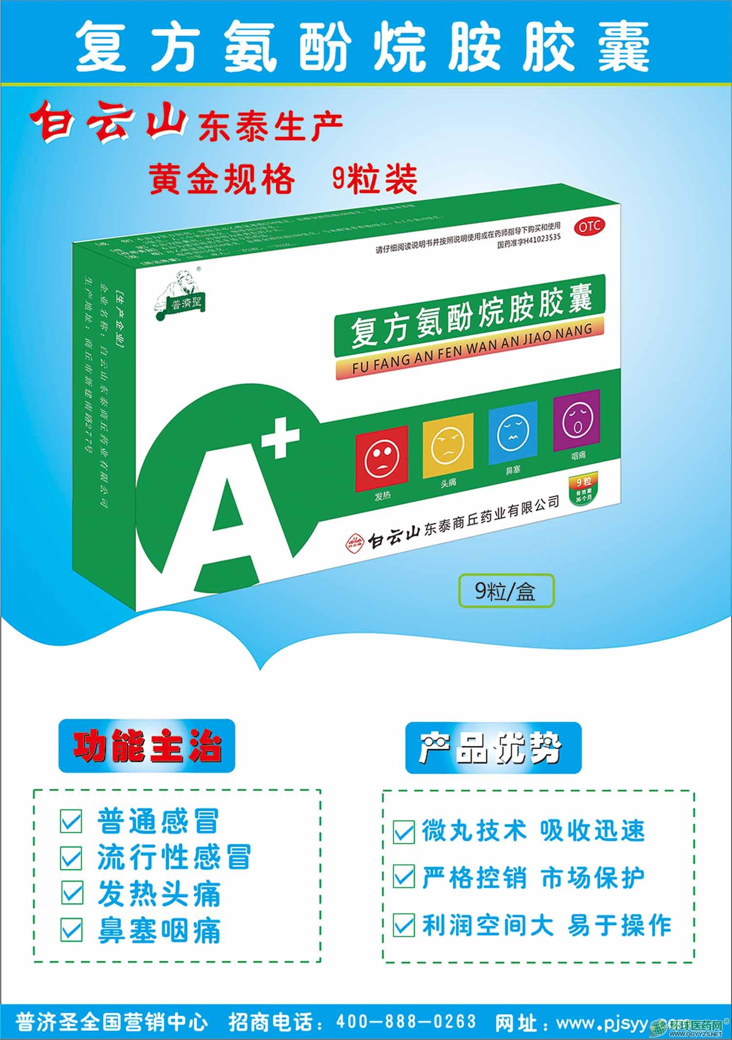 | 補(bǔ)充說(shuō)明 | 1,微丸技術(shù)工藝,有利于提高生物利用度,減少對(duì)胃的刺激。 2,白云山(商丘)東泰制藥廠,老百姓信任度更高。 3,內(nèi)含對(duì)乙酰氨基酚,(解熱,鎮(zhèn)痛),金剛烷胺(可抗.亞一甲型流感病毒,可抑制病毒的繁殖),***(中樞性興奮藥,可以提高其他藥物療效,同時(shí)降低藥物所帶來(lái)的嗜睡,頭暈的)馬來(lái)酸氯苯那敏(抗過(guò)敏作用,可以減輕鼻塞,流涕,打噴嚏等癥狀),人工牛黃,解熱鎮(zhèn)驚的作用. 4,一盒9粒,一次一粒,一天兩次,4.5天用量。(為消費(fèi)者節(jié)省每一分錢,600盒一件) 5,全是新批號(hào),工藝先進(jìn),有效期是3年,比市面95%的廠家效期都長(zhǎng)。 6,與原研單位工藝一樣,效果質(zhì)量有**。 7,廣告帶動(dòng),銷量自然不成問(wèn)題。 8,企業(yè)積極的做一致性報(bào)告,無(wú)后顧換產(chǎn)品之憂,有利于長(zhǎng)期合作。 |