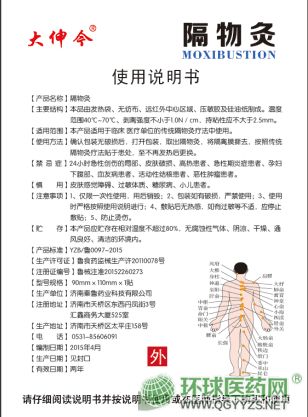 | 使用方法 | 確認(rèn)報裝無破損后,打開包裝,取出隔物灸,將隔離膜撕去,按照傳統(tǒng)隔物灸療法貼于患處,至不再發(fā)熱后更換 |