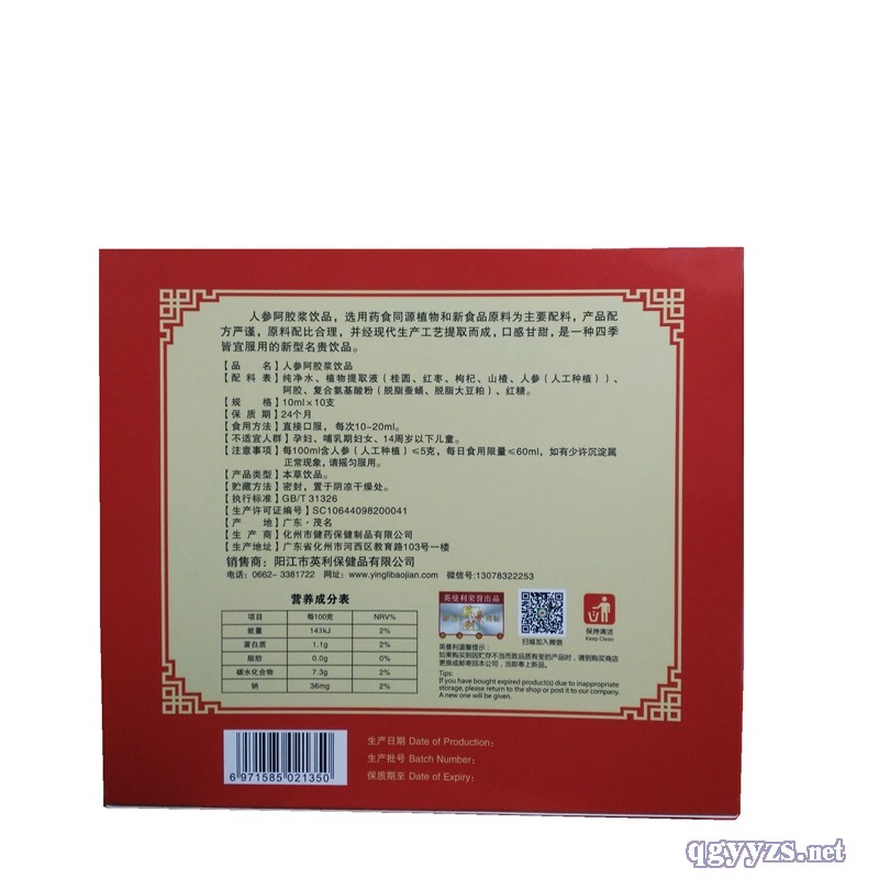 | 主要成分 | 人參(人工種植)、阿膠、桂圓、紅棗、寧夏枸杞、山楂、紅糖、純凈水 |