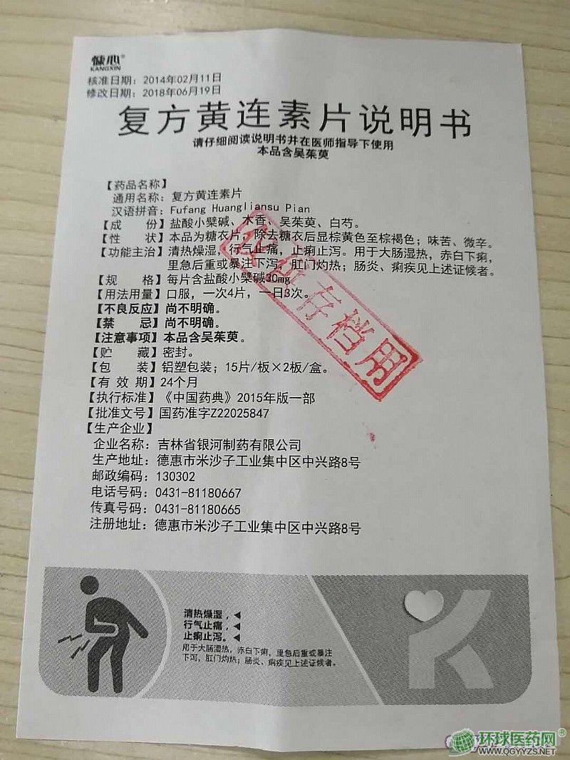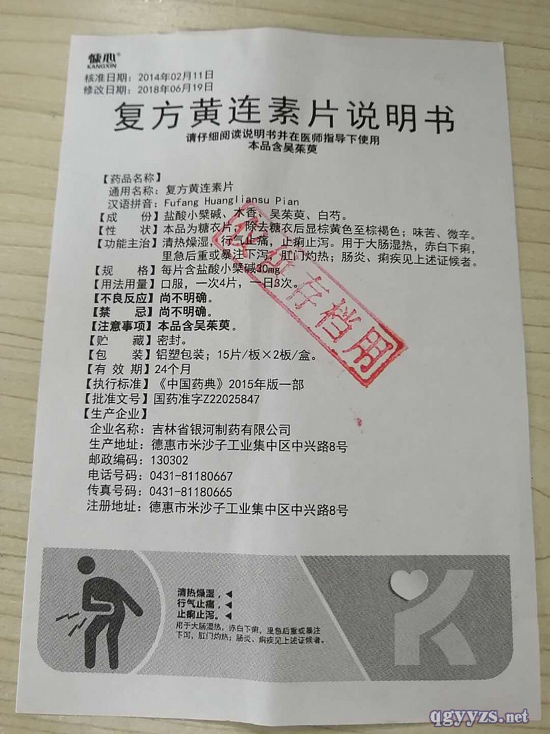 | 作用機理 | 復(fù)方黃連素片主要有抗菌,解痙,止痛,止瀉等作用。 1.抗菌:本品及其單味黃連素、木香、吳茱萸、白芍等均有抗菌作用。 2.解痙:本方白芍、木香、吳茱萸均有解痙作用。 3.止痛:本方白芍有**的鎮(zhèn)痛效果。 4.止瀉:本方黃連素能對抗蓖麻油或番瀉葉引起小鼠腹瀉。 復(fù)方黃連素片有清腸熱、行氣緩急、止痛止瀉之功。用于大腸濕熱,赤白下痢,里急后重或暴注下瀉,肛門灼熱;腸炎、痢疾見上述證候者。用法用量:口服,一次4片,一日3次。 |