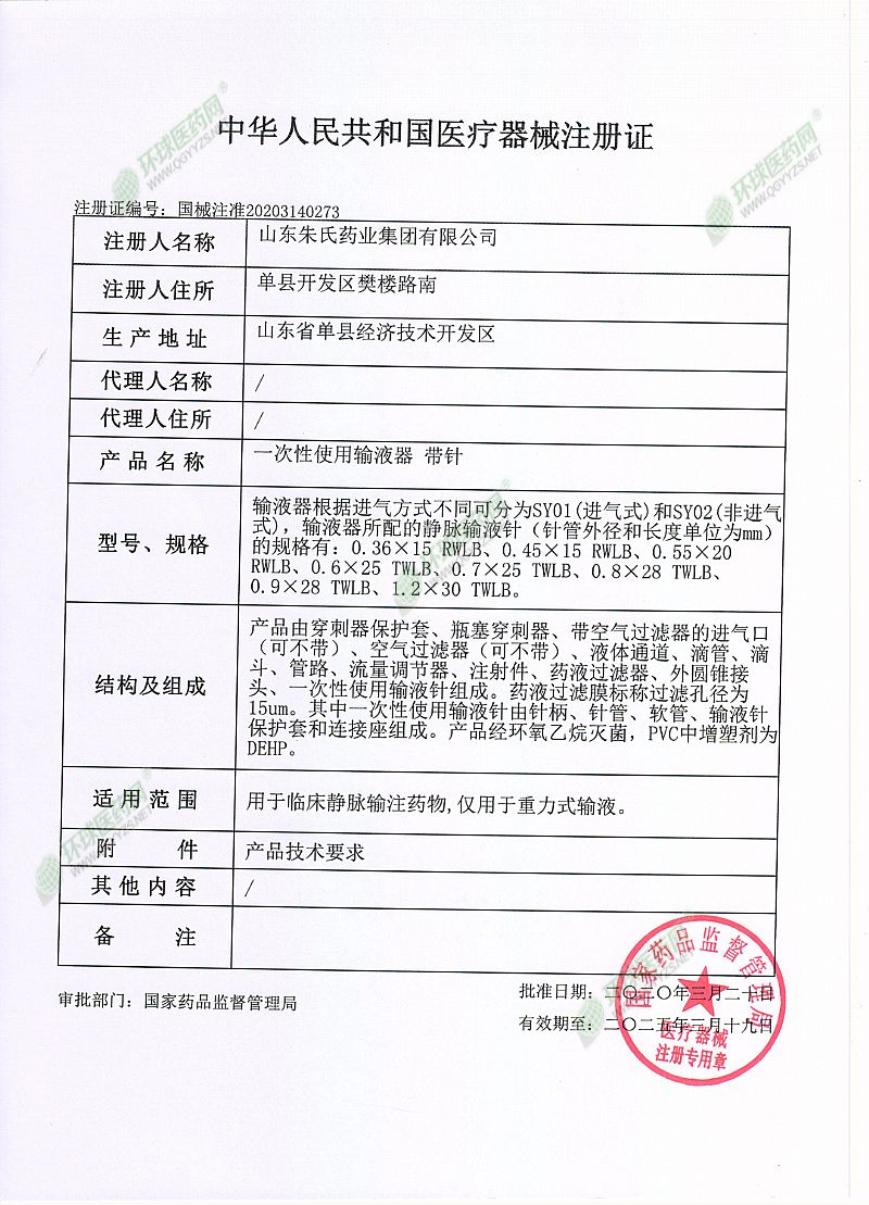 | 其它說明 | 山東朱氏藥業(yè)集團(tuán)一次性使用精密過濾輸液器(避光性,高透性),一次性使用靜脈留置針,一次性使用無菌注射器,一次性使用配藥用注射器,醫(yī)用超聲耦合劑,一次性使用真空采血管,一次性使用胃管,一次性使用醫(yī)用導(dǎo)尿包無菌雙腔硅膠尿管成人男女等醫(yī)療器械,資質(zhì)齊全,多個(gè)省區(qū)中標(biāo),歡迎來電咨詢 |