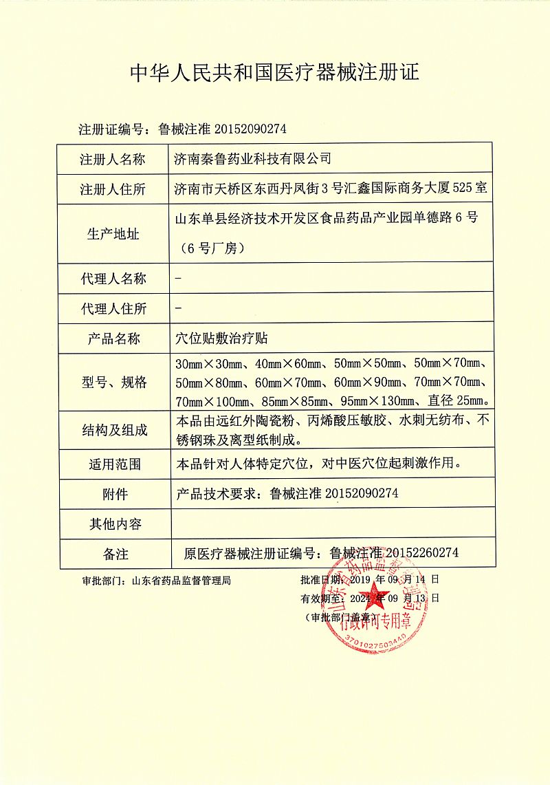 | 產(chǎn)品用途 | 詳見包裝說明以及內(nèi)置說明【產(chǎn)品名稱】穴位貼敷治療貼 【結(jié)構(gòu)及組成】本品由遠紅外陶瓷粉、丙烯酸壓敏膠、水刺無紡布、不銹鋼珠及離型 紙制成。穴位貼敷治療貼的壓敏膠布剝離強度不小于1.0N/cm,持粘性應(yīng) 不大于2.5mm,遠紅外發(fā)射波長范圍8μm—15μm,法向比輻射率≥75%。 【適用范圍】本品針對人體特定穴位,對中醫(yī)穴位起刺激作用。 【使用方法】1、清潔相應(yīng)穴位,先以拇指依次揉按相應(yīng)穴位,每次1~2分鐘,范圍由小 到大。力量由輕到重,探尋敏感點。 2、確認包裝無破損后,打開包裝,取出穴位貼敷治療貼,將貼劑的隔離 膜撕去,以鋼珠對準相應(yīng)穴位敏感點貼壓,1片/穴、天,每日適度按 壓3~5次,每次3~5分鐘,1個療程為10天,療程間隔2~3天。 【產(chǎn)品禁忌癥】糖尿病、高熱患者慎用;孕婦、皮膚潰爛處禁用。 |