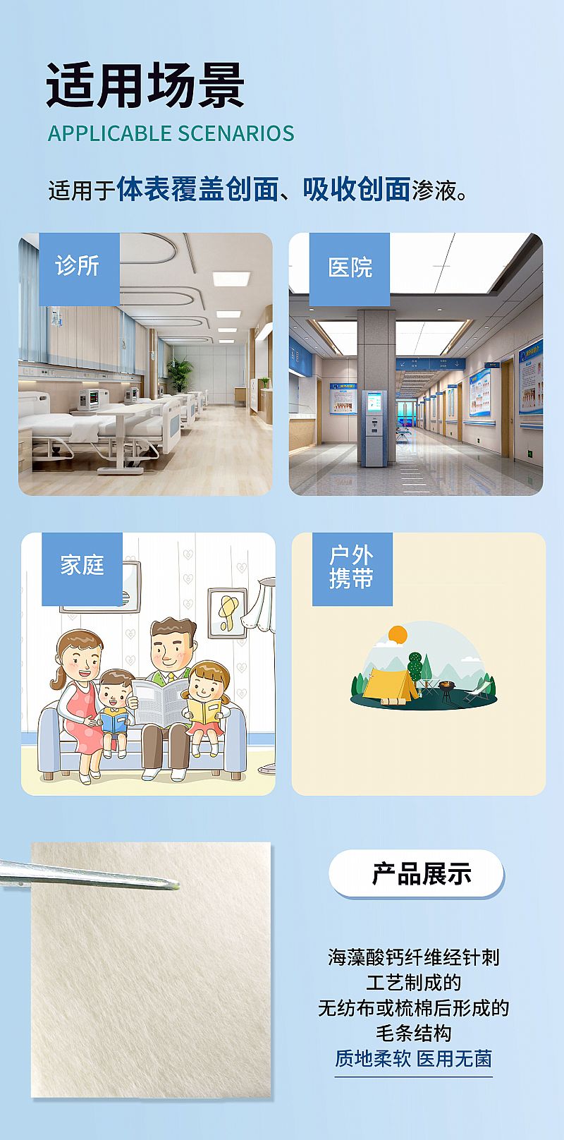 | 產(chǎn)品用途 | 適用于體表覆蓋創(chuàng)面,吸收創(chuàng)面滲液。 |