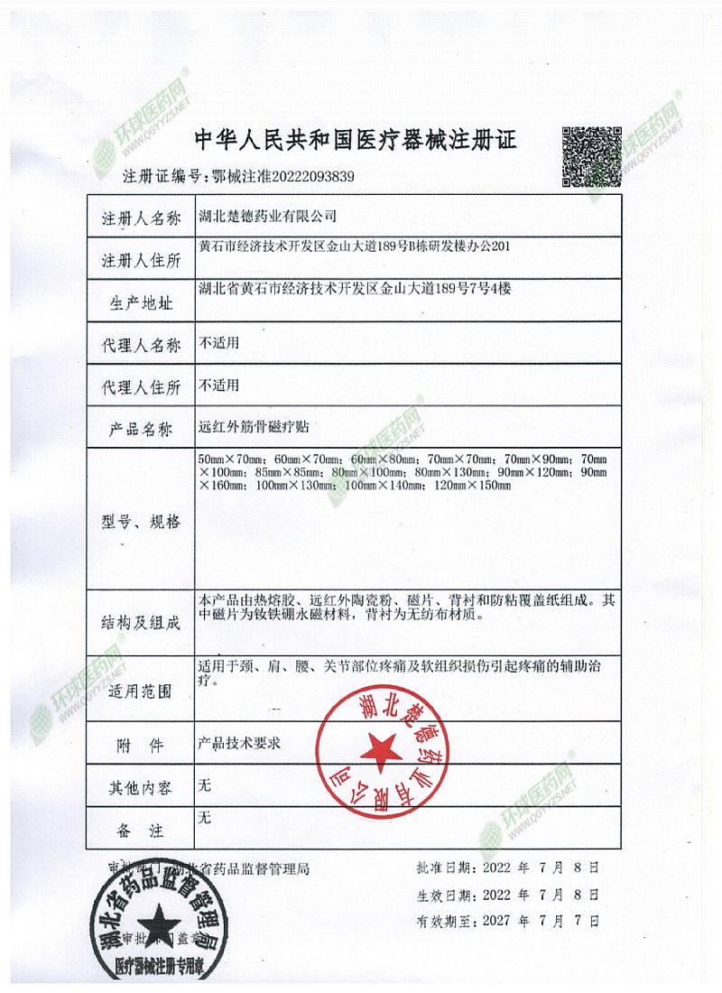 | 補(bǔ)充說(shuō)明 | 【產(chǎn)品名稱】遠(yuǎn)紅外筋骨磁療貼 【型號(hào)規(guī)格】50mm×70mm;60mm×70mm;60mm×80mm;70mm×70mm;70mm×90mm;70mm×100mm;85mm×85mm;80mm×100mm;80mm×130mm;90mm×120mm;90mm×160mm;100mm×130mm;100mm×140mm;120mm×150mm。 【產(chǎn)品性能】本品磁感應(yīng)強(qiáng)度應(yīng)為20mT~150mT;遠(yuǎn)紅外法向發(fā)射率應(yīng)≥85%。 【使用方法】外用,將所貼部位皮膚清洗干凈,揭去防粘紙,貼于患處。 【禁忌癥】 1、有開放性傷口者禁用; 2、植入心臟起搏器及金屬異物局部禁用;嚴(yán)重心,肝,肺,腎衰竭患者禁用; 3、孕婦下腹部禁用; 4、出血及有出血傾向者禁用; 5、對(duì)磁療有明顯不良反應(yīng)者禁用; 6、體質(zhì)極度虛弱者禁用。 【注意事項(xiàng)】 1、本品為一次性使用,勿重復(fù)使用; 2、本產(chǎn)品為外用,禁止口服; 3、皮膚過(guò)敏者,如出現(xiàn)瘙癢、皮疹等,應(yīng)立即停止使用。 【貯藏及運(yùn)輸】密封、置室內(nèi)干燥處。包裝好的產(chǎn)品在運(yùn)輸過(guò)程中應(yīng)防曬,防潮,并**產(chǎn)品包裝在運(yùn)輸途中不受損壞。 【有效期】?jī)赡?br>【生產(chǎn)許可證編號(hào)】鄂藥監(jiān)械生產(chǎn)許20221170號(hào) 【醫(yī)療器械注冊(cè)證編號(hào)】鄂械注準(zhǔn)20222093839 【醫(yī)療器械產(chǎn)品技術(shù)要求編號(hào)】鄂械注準(zhǔn)20222093839 【注冊(cè)人/生產(chǎn)企業(yè)/售后服務(wù)單位】湖北楚德藥業(yè)有限公司 【注冊(cè)人住所】黃石市經(jīng)濟(jì)技術(shù)開發(fā)區(qū)金山大道189號(hào)B棟研發(fā)樓辦公201 【生產(chǎn)地址】湖北省黃石市經(jīng)濟(jì)技術(shù)開發(fā)區(qū)金山大道189號(hào)7號(hào)4樓 【聯(lián)系電話】 0714-8660120 【說(shuō)明書編制/修訂日期】2022年7月8日 |