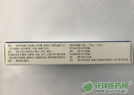 | 主要成分 | 熟地黃、雞血族、淫羊疆、骨碎補(bǔ)、狗脊(鹽制、女貞子(鹽制)、肉蓯蓉(蒸)、牛膝、萊菔子(炒)。 |