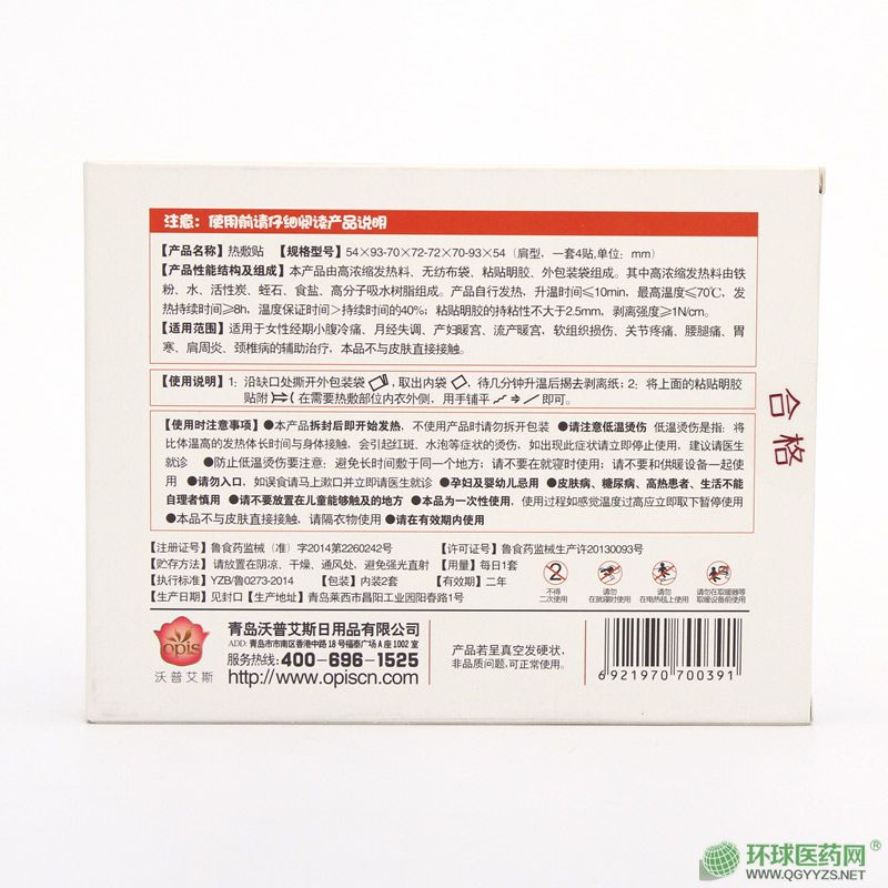 | 使用方法 | 1、沿缺口處撕開外包裝袋,取出內袋,待幾**升溫后揭去剝離紙; 2、將上面的粘貼明膠貼附(在需要熱敷部位內衣外側,用手鋪平即可。) |