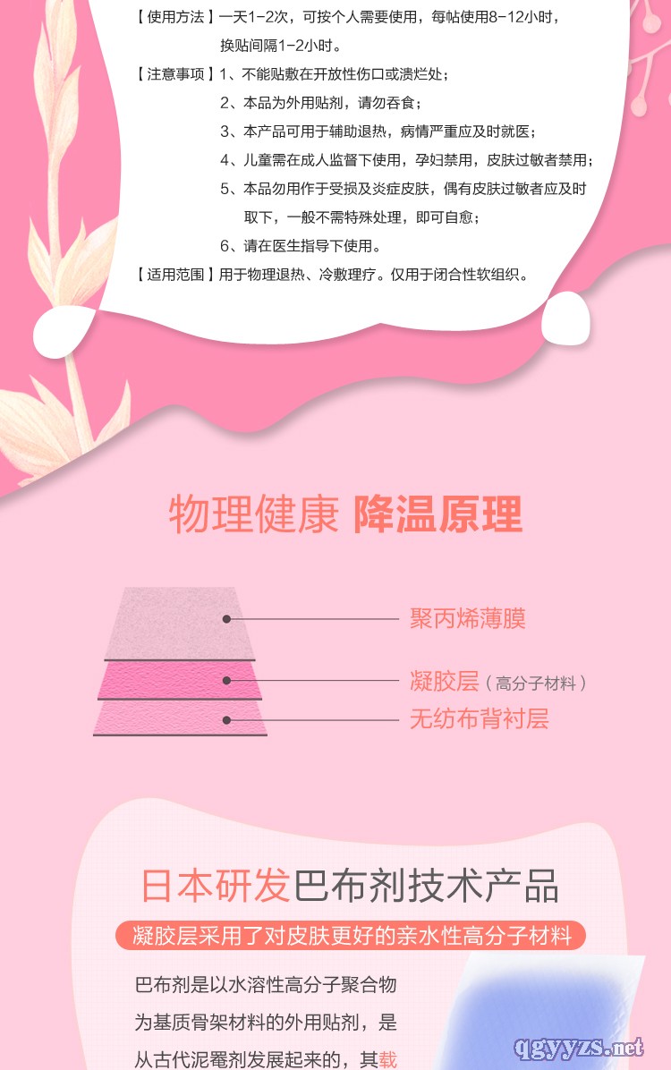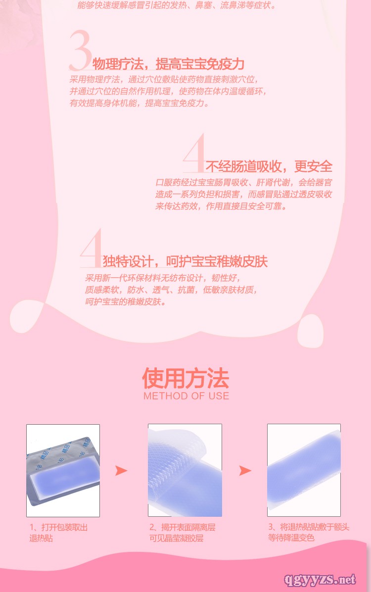 | 使用方法 | 1.去掉包裝,揭開透明膜,將醫(yī)用退熱貼水凝膠膠面貼于額前.頸部.太陽穴或其他需要降溫.冷敷的部位,可以根據(jù)需要剪成相應(yīng)大小使用。 2.請勿貼于毛發(fā)處,如皮膚表面有水分,請摖試干凈后再使用,一次使用一片,避免反復(fù)使用,以免影響粘力及功能 |