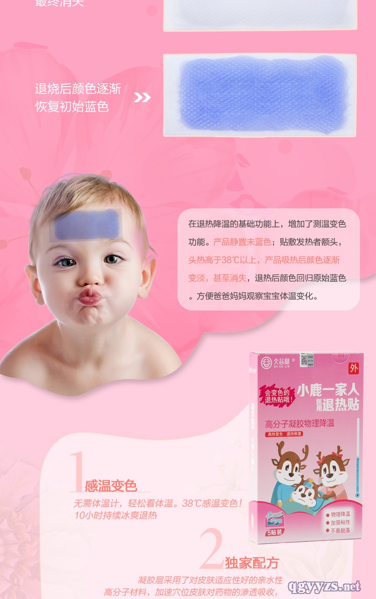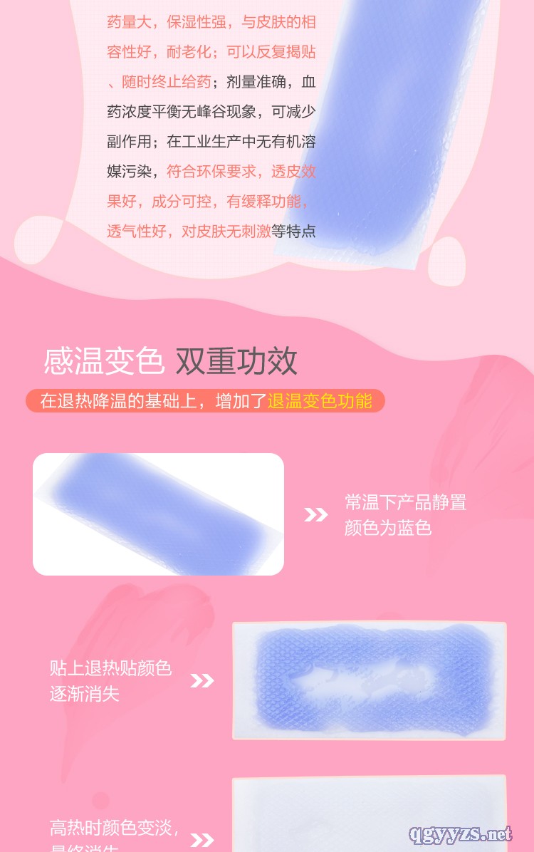 | 產(chǎn)品賣點(diǎn) | 本產(chǎn)品,增加了測溫變色功能,靜置為藍(lán)色,貼敷發(fā)燒者額頭,當(dāng)發(fā)燒到38°c以上,產(chǎn)品吸熱后可從無紡布直接看到測溫膠面顏色逐漸變淡,直到白色透明,退燒后低于38°c,產(chǎn)品由白色變成藍(lán)色,形成高燒變色,低燒恢復(fù)的效果,通過顏色的變化,方便觀察孩子的發(fā)燒情況 |