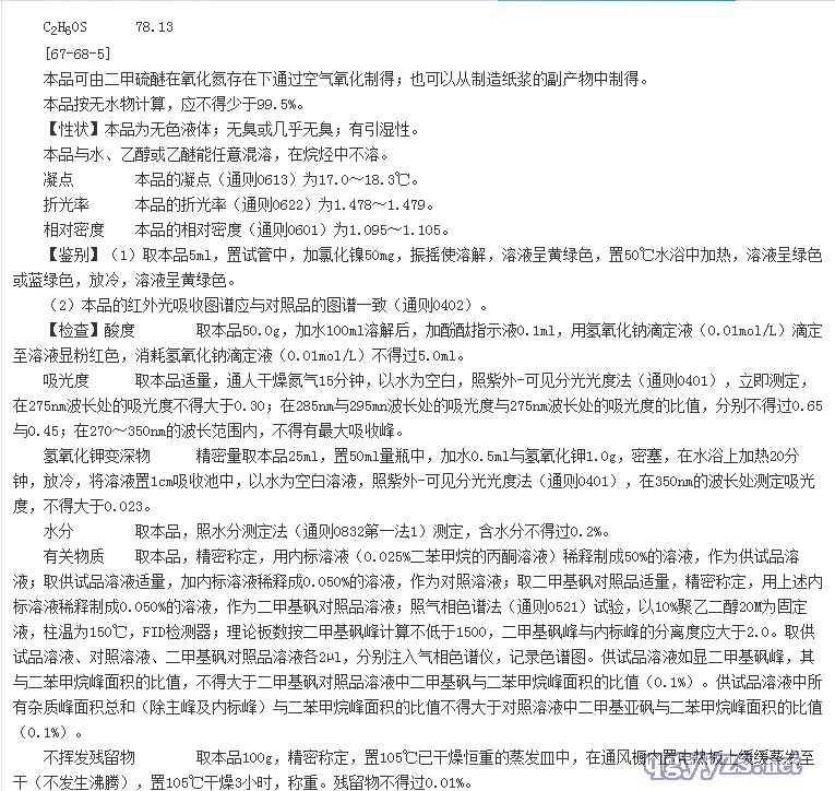 | 補(bǔ)充說明 | 二甲基亞砜是一種既溶于水又溶于有機(jī)溶劑的極為重要的非質(zhì)子極性溶劑。廣泛用作溶劑和反應(yīng)試劑,具有很高的選擇抽提能力。二甲基亞砜本身有消炎止痛,利尿,鎮(zhèn)靜等作用,在醫(yī)藥工業(yè)中可以直接用作某些藥物的原料及載體。有"萬靈藥"之稱,常作為止痛藥物的活性組分添加于藥物之中。 1、用于芳烴抽提、樹脂及染料的反應(yīng)介質(zhì)、腈綸聚合、抽絲的溶劑等 2、可作有機(jī)溶劑、反應(yīng)介質(zhì)及有機(jī)合成中間體。用途極廣。本品具有很高的選擇性抽提能力, 用作丙烯酸樹脂及聚砜樹酯的聚合和縮合溶劑、聚丙烯腈及乙酸纖維的聚合抽絲溶劑、烷烴與芳烴分離的抽提溶劑、 用于芳烴、丁二烯抽提,腈綸紡絲、塑料溶劑及有機(jī)合成染料、制藥等工業(yè)的反應(yīng)介質(zhì)。在醫(yī)藥方面, 二甲基亞砜有消炎止痛作用,對皮膚有強(qiáng)滲透力,因而可溶解某些藥物,使這類藥物向人體滲透從而達(dá)到治療目的 。利用二甲基亞砜的這種載體特性,也可作為農(nóng)藥的添加劑。在某些農(nóng)藥中添加少量二甲基亞砜, 有助于農(nóng)藥向植物內(nèi)滲透,以提高藥效。二甲基亞砜還可作為合成纖維的染色溶劑、去染劑、染色載體, 也可作為回收乙炔、二氧化硫的吸收劑,合成纖維改性劑,防凍劑以及電容介質(zhì)、剎車油、稀有金屬提取劑等。 |