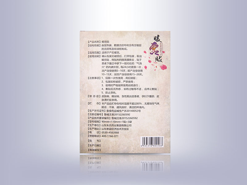 | 使用方法 | 確認包裝無損后,打開包裝,取出暖宮貼,將貼劑的隔離膜撕去,貼于患者下腹正中臍下一指對應的“氣海穴”的內(nèi)褲外側,每24小時更換一次,流產(chǎn)連續(xù)使用5-10天;順產(chǎn)連續(xù)使用10-15天;剖腹產(chǎn)連續(xù)使用15-20天。 |