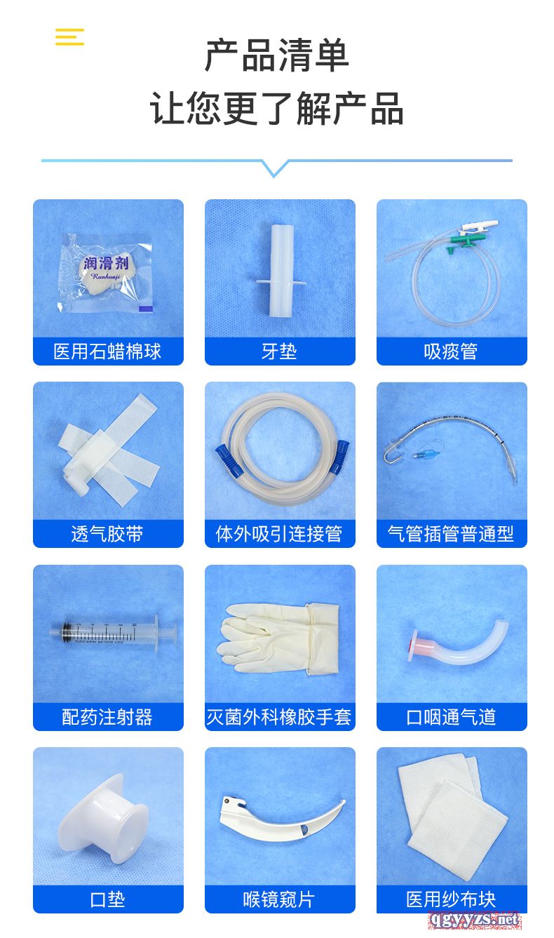 | 主要成分 | 一次性使用氣管插管包由基本配置:普通型氣管插管或加強(qiáng)型氣管插管,選用配置:導(dǎo)芯、一次性使用配藥用注射器(僅供套囊充氣使用)、一次性使用喉鏡窺片、一次性使用吸痰管、一次性使用體外吸引連接管、一次性使用口咽通氣道、牙墊、口墊、醫(yī)用紗布?jí)K、包布、一次性使用滅菌橡膠外科手套、醫(yī)用石蠟棉球、透氣膠貼(非織造布膠帶)、托盤組成。 |