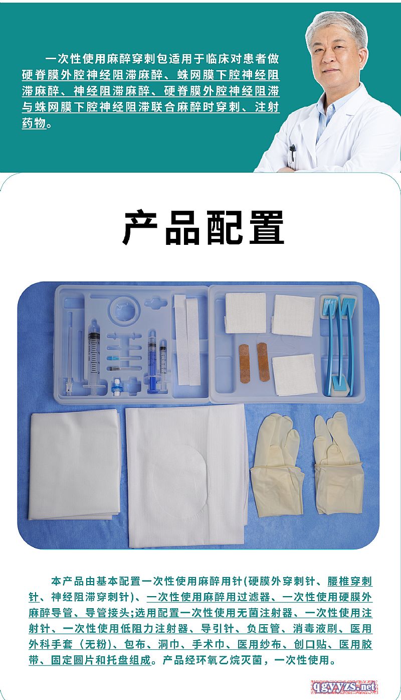 | 產(chǎn)品用途 | 一次性使用麻醉穿刺包適用于臨床對(duì)患者做硬脊膜外腔神經(jīng)阻滯麻醉、蛛網(wǎng)膜下腔神經(jīng)阻滯麻醉、神經(jīng)阻滯麻醉、硬脊膜外腔神經(jīng)阻滯與蛛網(wǎng)膜下腔神經(jīng)阻滯聯(lián)合麻醉時(shí)穿刺、注射藥物。 |