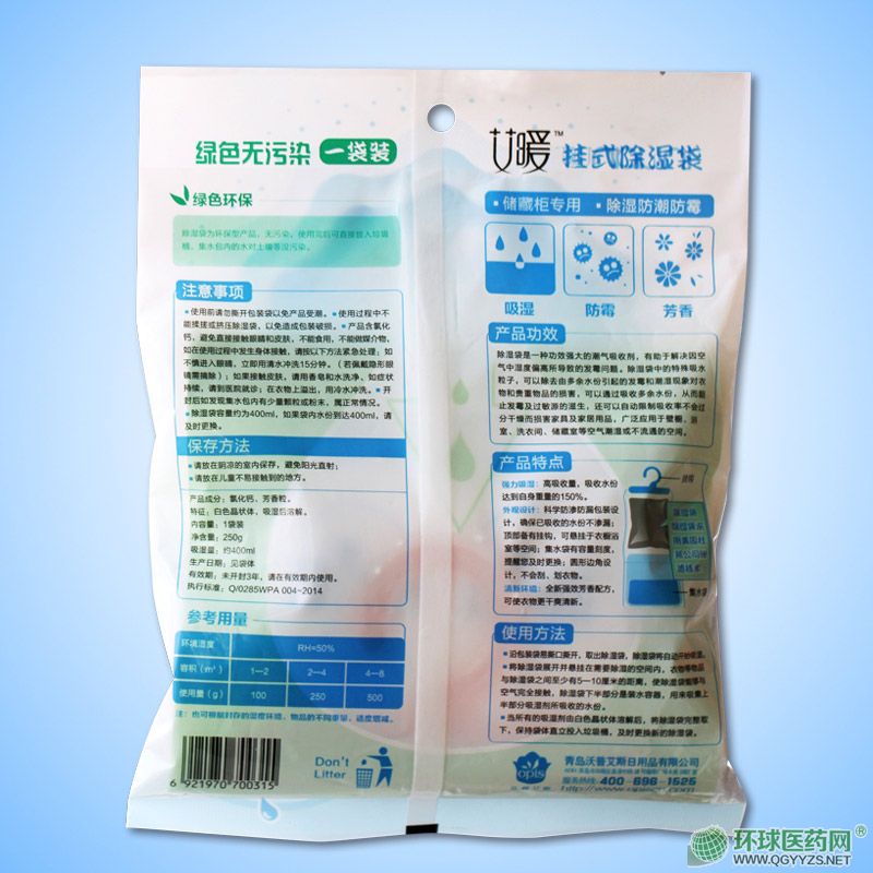 | 產(chǎn)品賣點(diǎn) | 除濕袋是一種功效強(qiáng)大的潮氣吸收劑,有助于解決因空氣中濕度偏高所導(dǎo)致的發(fā)霉的問題。除濕袋中的特殊吸水粒子,可以除去由多余水份引起的發(fā)霉和潮濕現(xiàn)象對(duì)衣物個(gè)貴重物品的損害,可以通過洗手多余水份,從而阻止發(fā)霉及過敏源的滋生,還可以自動(dòng)限制吸收率不會(huì)過分干燥而損害家具及家居用品,廣泛應(yīng)用于壁櫥、浴室、洗衣間、儲(chǔ)藏室等空氣潮濕或不流通的空間。 |