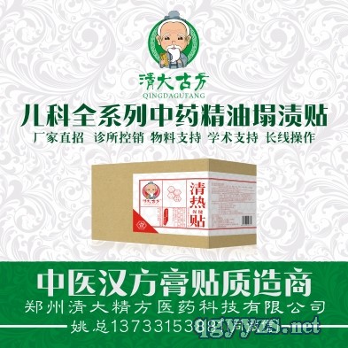 | 補(bǔ)充說(shuō)明 | 清大古方系列中藥精油塌漬貼 一、微分態(tài),吸收快,作用迅速 清大古方精油塌漬貼是由純中藥提取物和中藥油制成,無(wú)輔料阻滯藥物吸收,如熱熔膠等,有效成分呈微分態(tài),更容易透皮 吸收; 二、含量高,更有效 清大古方精油塌漬貼每貼含中藥提取物和中藥油相當(dāng)于原生藥材12-20克,含藥量高,更有效; 三、臨床經(jīng)方,現(xiàn)代工藝,療效驗(yàn)證,**有效 清大古方精油塌漬貼系有經(jīng)多年臨床使用的經(jīng)方及歷代中醫(yī)名家的經(jīng)方,經(jīng)過(guò)科研院校再研究的成果轉(zhuǎn)化產(chǎn)品,成品制劑中 充分利用如提取、低溫發(fā)酵等現(xiàn)代中藥制備技術(shù),使藥物有效成分更易析出、滲透和吸收,在成方后和成品上市前,以臨床 制劑形式在多個(gè)三家兒童醫(yī)院應(yīng)用,效果明顯,**有效,被廣大醫(yī)者好評(píng)。 四、經(jīng)皮給藥,操作簡(jiǎn)單,患兒適從性好 清大古方精油塌漬貼通過(guò)貼敷與特定穴位和部位,經(jīng)皮給藥,直達(dá)病灶,作用迅速;不經(jīng)口,無(wú)創(chuàng)給藥,更易被患兒接受; 不傷脾胃,不毒肝腎,更易于被患兒家長(zhǎng)接受。 清大古方精油塌漬貼系中醫(yī)綠色療法,是國(guó)家大力倡導(dǎo)發(fā)展的方向。 六、包裝精美,自主設(shè)計(jì),不妨不冒(歡迎同行模仿產(chǎn)品內(nèi)在品質(zhì),鄙視抄襲外觀包裝);公司提供全套的物料支持; 七、固定層(膠布背托)采用德國(guó)進(jìn)口的漢高油膠,自行涂制,不過(guò)敏、不脫落、透氣性好; 八、效果明顯(部分病癥可以達(dá)到一次見(jiàn)效),PS:我們只會(huì)務(wù)實(shí)的做品質(zhì),真實(shí)的宣傳及傳遞產(chǎn)品信息; 九、直接貼敷,貼敷穴位及方法便于掌握,不需要現(xiàn)場(chǎng)調(diào)制; 十、相應(yīng)國(guó)家大力發(fā)展弘揚(yáng)中醫(yī)中藥綠色療法的大政方針,限制抗生素、激素及化藥; 十二、公司提供全套產(chǎn)品物料,支持圓桌會(huì)、學(xué)術(shù)會(huì); 鄭州清大精方醫(yī)藥科技有限公司;姚總13733153881(同微信) |