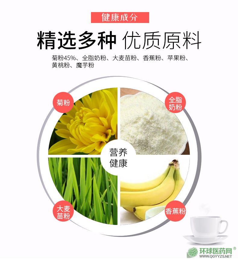 | 主要成分 | 全脂奶粉、黃桃粉、大麥苗粉、魔芋粉、菊粉、香蕉粉、蘋(píng)果粉 |