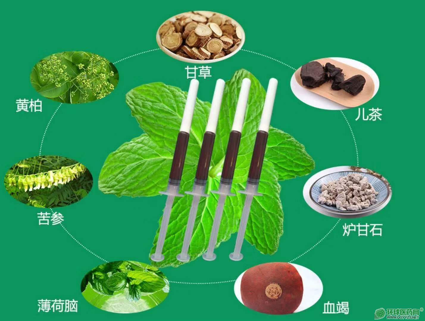 | 主要成分 | 蛇床子提取物(FructusCnidii )4%, 五倍子提取物(GallaChinensis)2%, 地榆提取物(RadixSanguisorbae)2%, 百部提取物(RadixStemonae)3%, 黃柏提取物(CortexPhellodendriChinsis)4%, 冰片(Borneolum)0.2%, 大黃提取物(RadixetRhizomaRhei)3%, 苦參提取物(RadixSophoraeFiavescentis)4%, 殼聚糖提取物1%, 透明質(zhì)酸鈉1%。 |