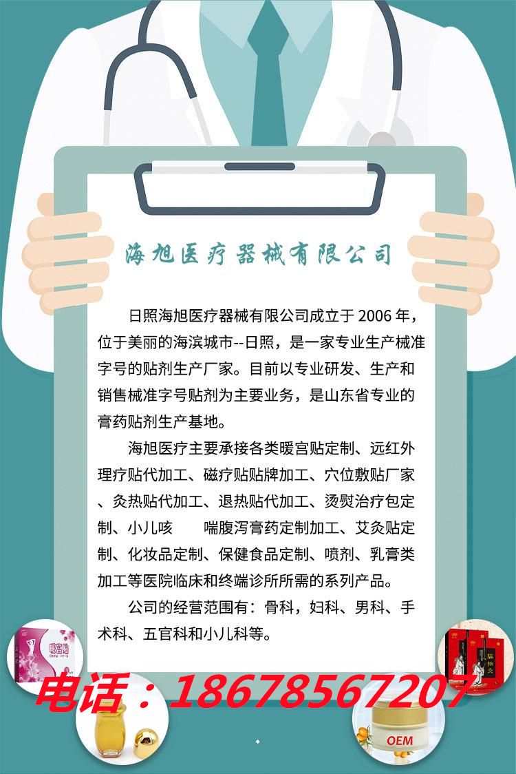 | 補充說明 | 山東日照海旭器械有限公司艾炙帖 醫(yī)保收費膏藥產品精油艾灸貼,是走臨床骨傷科、中醫(yī)科、康復理療科、針灸推拿科、風濕科等科室的醫(yī)保膏藥產品,文號獨立正規(guī),該產品在全國多地高價中標掛網! |