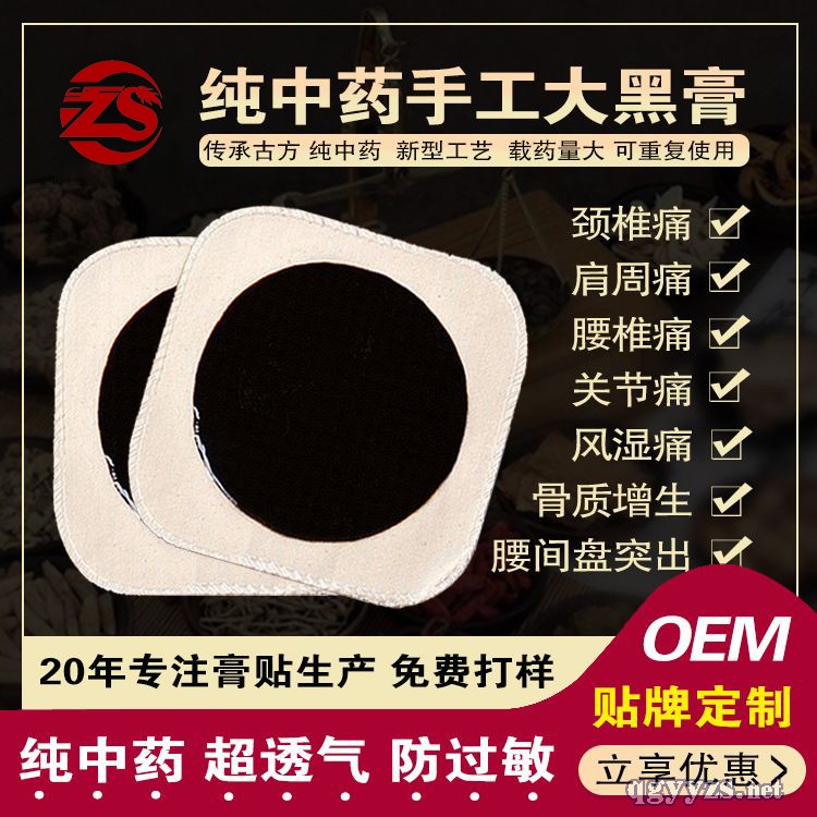 | 產(chǎn)品用途 | 山東皇圣堂藥業(yè)有限公司膏藥生產(chǎn)廠家現(xiàn)面向全國承接黑膏藥醫(yī)用冷敷貼貼牌加工業(yè)務(wù);适ヌ煤诟嗨庍\(yùn)用中醫(yī)貼敷療法透皮技術(shù),通過貼于體表的膏藥刺激末梢神經(jīng),進(jìn)而反射擴(kuò)張血管,促進(jìn)局部血液循環(huán),激活細(xì)胞組織,松弛血管平滑肌,增強(qiáng)血管自身節(jié)律性運(yùn)動(dòng)的作用,從而改善周圍組織營養(yǎng),產(chǎn)生消炎、止痛、活血化瘀、通經(jīng)走絡(luò)、開竅透骨、祛風(fēng)除濕、防止復(fù)發(fā)的治療目的。同時(shí)黑膏藥醫(yī)用冷敷貼中的藥物機(jī)制在患處通過皮膚滲透達(dá)皮下組織,在局部產(chǎn)生藥物濃的相對(duì)優(yōu)勢(shì),從而發(fā)揮較強(qiáng)的藥理作用。 |