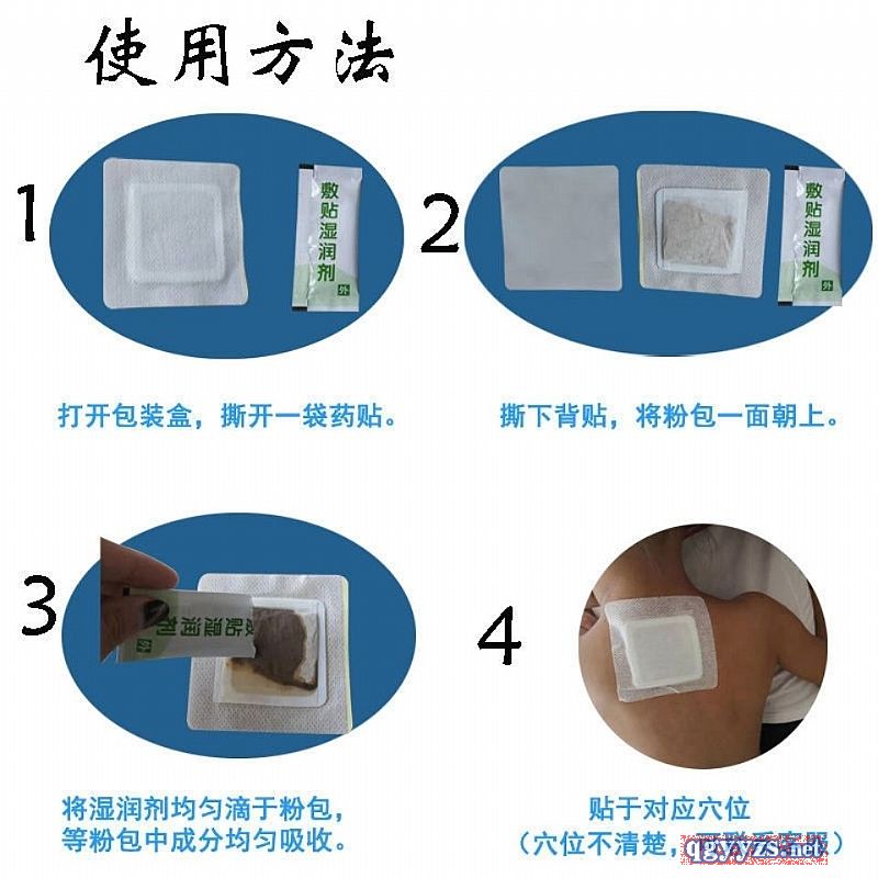 | 使用方法 | 將穴位周圍清洗干凈。待干燥后,揭去本品防粘紙,貼于大椎穴、神闕穴、天突穴、涌泉穴。每貼敷6-8小時更換一次。 |