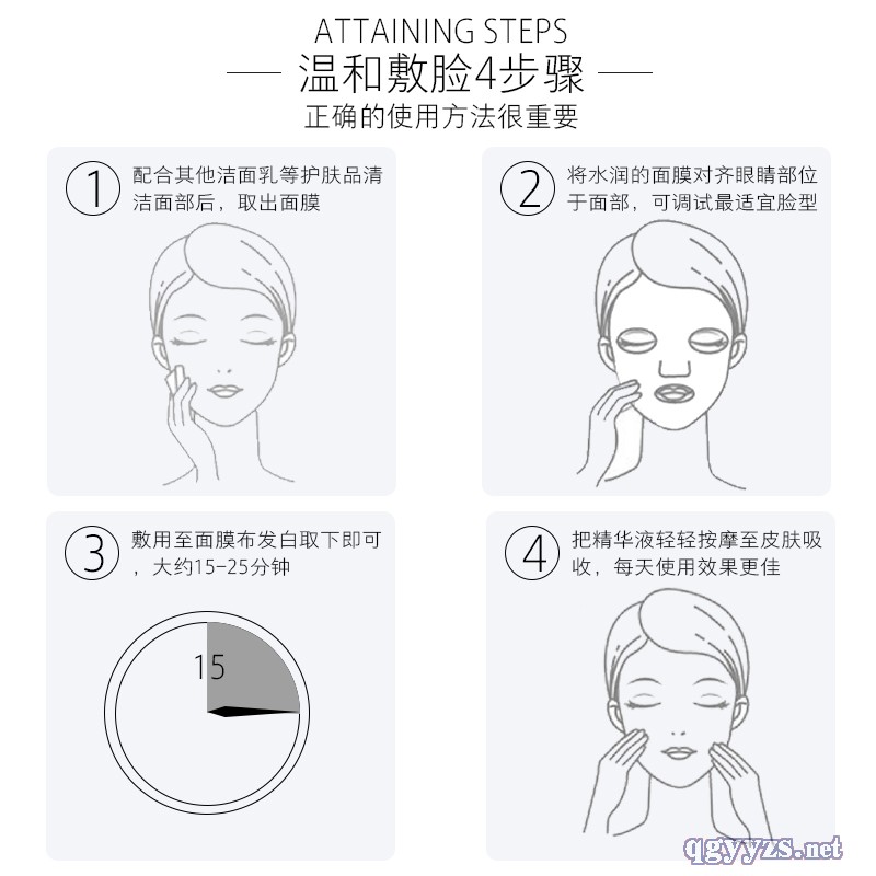 | 使用方法 | 潔面爽膚后,取出面膜并將其緊貼于面部后取下珠光膜,敷至15-25分鐘,清水洗凈,接著后續(xù)保養(yǎng)即可。 |