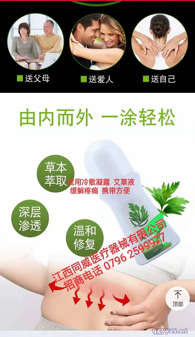 | 產(chǎn)品賣點 | 醫(yī)用冷敷凝露:艾草液 止痛消痛 天然植物配方,緩解不適,老少皆宜 冷敷凝露---艾草液 無煙霧艾灸更健康,告別煙熏霧繞的傳統(tǒng)艾灸 型號:1:肩周型; 2:腰腿型 適用范圍:適用于常年工作壓力和不良的生活習慣,導致身體出現(xiàn)**疼痛狀況,止痛消腫,有溫中散寒、止痛作用,艾草液滲透到筋骨,能溫通氣血,透達經(jīng)絡,起到溫經(jīng)通絡、祛寒除濕的保健功能,對于腰腿、頸椎等各個關(guān)節(jié)疼痛,涂抹后可起到明顯緩解效果。刮痧、艾灸、拔罐、推拿輔助加強使用艾草液使用效果更明顯。艾草液由幾十種中藥配方,純中藥,無添加,一瓶單部位涂抹的情況下能用100次,直達病灶,標本兼治,接觸皮膚有火辣辣的感覺。滾球型,攜帶方便,省事省力。 使用方法:外用,打開瓶蓋,將艾草液滴涂置于在患處,按摩3--5分鐘,每日2--3次,根據(jù)病情可適當調(diào)整次數(shù)。 |