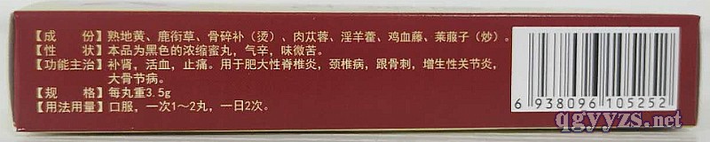 | 功能主治 | 補(bǔ)腎,活血,止痛。用于肥大性脊椎炎,頸椎病,跟骨刺,增生性關(guān)節(jié)炎,大骨節(jié)病。 |
