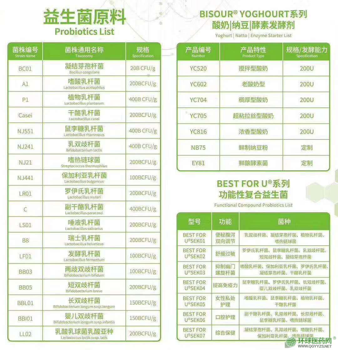 | 主要成分 | 1.鼠李糖乳桿菌2.羅伊氏乳桿菌3.長雙歧桿菌4.植物乳桿菌5.短雙歧桿菌6.瑞士乳桿菌7.嗜熱鏈球菌8.嗜酸乳桿菌9.副干酪乳桿菌10.凝結芽孢桿菌BCO112。乳酸乳球菌乳酸亞種13.乳雙歧桿菌14.青春雙歧桿菌15.枯草芽孢桿菌16.動物雙歧桿菌17.發(fā)酵乳桿菌 |