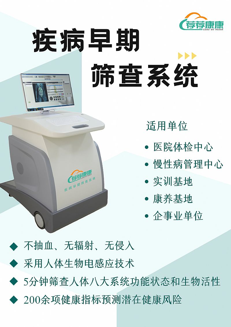 | 補充說明 | 健康風(fēng)險評估系統(tǒng)是海思普瑞(天津)人工智能醫(yī)療科技有限公司開發(fā)生產(chǎn)的一款健康體檢設(shè)備。 采用了當(dāng)前美國*先進(jìn)的生物醫(yī)學(xué)技術(shù),采用人體電阻抗測量技術(shù)結(jié)合脈搏血氧檢測技術(shù),快速掃描測量、采集人體阻抗及電位等實時數(shù)據(jù),并傳輸給系統(tǒng)的處理器,經(jīng)處理分析形成人體組織內(nèi)電阻抗分布 3D 圖像和檢查檢測結(jié)果的人體健康風(fēng)險篩查設(shè)備。該設(shè)備能夠?qū)粑到y(tǒng)、消化系統(tǒng)、自主神經(jīng)系統(tǒng)、泌尿生殖系統(tǒng)、心血管系統(tǒng)、內(nèi)分泌系統(tǒng)、腦、一般代謝功能做出健康早期風(fēng)險評估。并根據(jù)受檢測者的體質(zhì)特征給予多種健康指導(dǎo)方案。 |