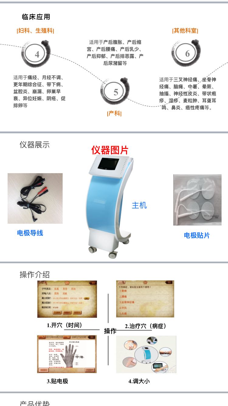 | 產(chǎn)品用途 | 1.“子午流注開穴法”為中醫(yī)特色項目,優(yōu)質(zhì)產(chǎn)品! 2.有單獨的醫(yī)保收費,該項目醫(yī)保收費編碼430000024,遼寧30吉林20黑龍江10/穴,常規(guī)采用10穴治療。2-3個月就能回收成本。 3.全省200家醫(yī)療機構(gòu)使用,530臺的在用量。標桿林立,可供參觀考察。 |