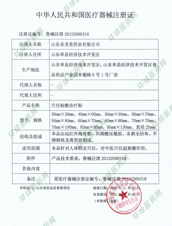 | 補充說明 | 【禁忌癥】孕婦、皮膚潰爛處禁用。 【慎用】糖尿病、高熱患者。 【注意事項】1.僅限一次性使用,使用后銷毀;2.敷貼后如有過敏等不適,應停止敷貼。 【貯存】本產品應貯存在相對濕度不超過80%,無腐爛性氣體,陰涼、干燥、通風良好、干凈的環(huán)境內。 【產品技術要求】魯械注準20152260318 【生產證許可】魯食藥監(jiān)械生產許20140114號 【注冊證編號】魯械注準20152260318 【生產單位】山東皇圣堂藥業(yè)有限公司 【生產地址】山東單縣經濟技術開發(fā)區(qū) 【有效期】兩年 皇圣堂穴位貼主要分為三個規(guī)格:穴位貼12貼裝、穴位貼8貼裝、穴位貼18貼裝。 承接穴位貼代加工、穴位貼oem貼牌定制、穴位貼招商代理——山東皇圣堂藥業(yè),可以寄樣,歡迎來電咨詢! |