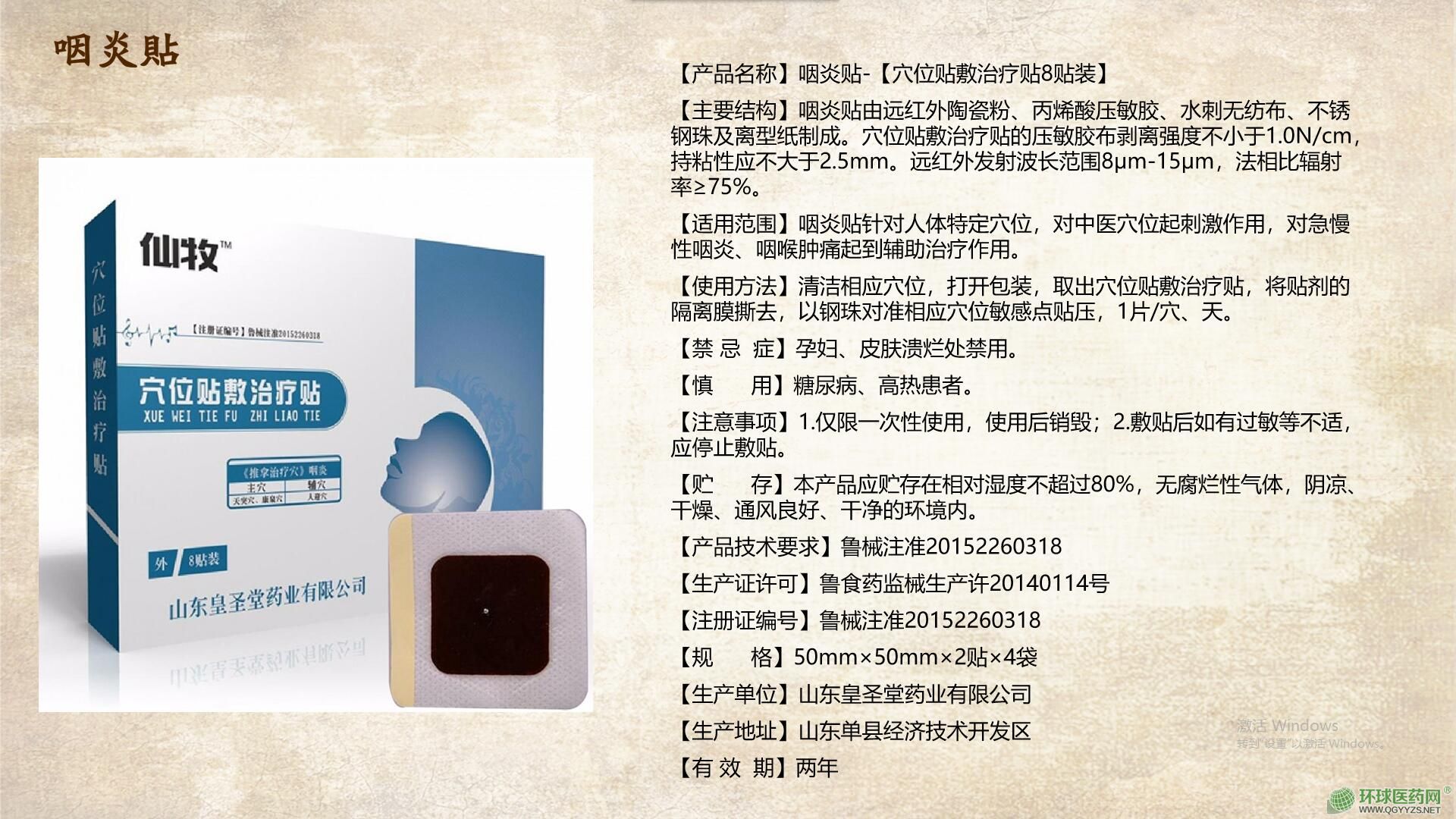 | 補(bǔ)充說(shuō)明 | 【主要結(jié)構(gòu)】咽炎貼由遠(yuǎn)紅外陶瓷粉、丙烯酸壓敏膠、水刺無(wú)紡布、不銹鋼珠及離型紙制成。穴位貼敷治療貼的壓敏膠布剝離強(qiáng)度不小于1.0N/cm,持粘性應(yīng)不大于2.5mm。遠(yuǎn)紅外發(fā)射波長(zhǎng)范圍8μm-15μm,法相比輻射率≥75%。 【注意事項(xiàng)】1.僅限一次性使用,使用后銷(xiāo)毀;2.敷貼后如有過(guò)敏等不適,應(yīng)停止敷貼。 【禁忌癥】孕婦、皮膚潰爛處禁用。 【慎用】糖尿病、高熱患者。 【貯存】本產(chǎn)品應(yīng)貯存在相對(duì)濕度不超過(guò)80%,無(wú)腐爛性氣體,陰涼、干燥、通風(fēng)良好、干凈的環(huán)境內(nèi)。 【產(chǎn)品技術(shù)要求】魯械注準(zhǔn)20152260318 【生產(chǎn)證許可】魯食藥監(jiān)械生產(chǎn)許20140114號(hào) 【注冊(cè)證編號(hào)】魯械注準(zhǔn)20152260318 【生產(chǎn)單位】山東皇圣堂藥業(yè)有限公司 【生產(chǎn)地址】山東單縣經(jīng)濟(jì)技術(shù)開(kāi)發(fā)區(qū) 【有效期】?jī)赡?/td> |