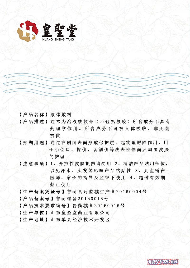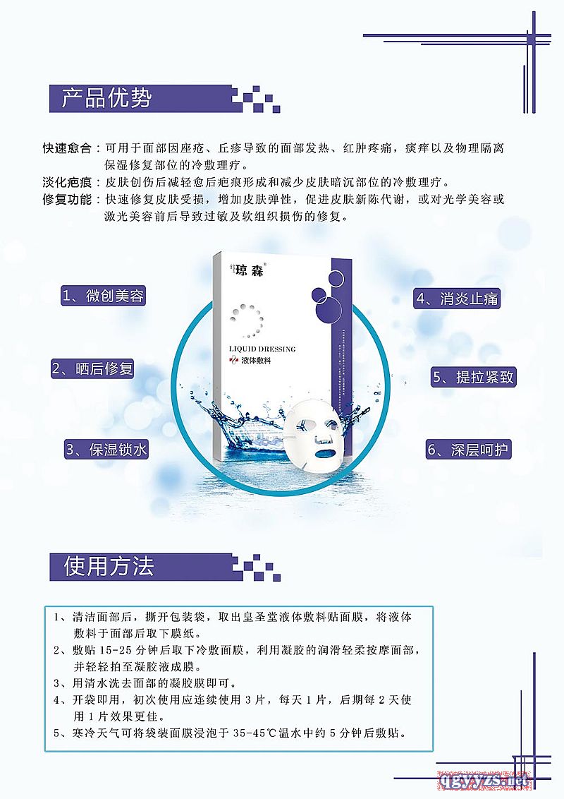 | 作用機理 | 皇圣堂液體敷料為一類械字號醫(yī)用冷敷貼,本產(chǎn)品成分溫和,不含酒精、激素和抗生素成分,無依賴,具有一定的冷數(shù)、舒、保濕、透氣功能;主要適用于物理降溫,冷敷理療,緩解疼痛及閉合性軟組織損傷 |