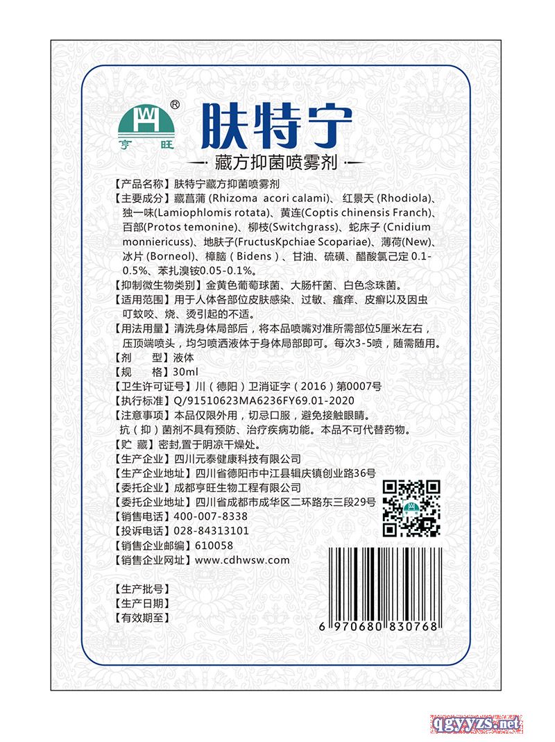 | 補充說明 | 本品按照藏醫(yī)藥理論,選用生長在氣候十分惡劣的青藏高原的藏藥科學配方,采用現(xiàn)代生產(chǎn)工藝技術提取濃縮精制而成。 1、濃縮藏藥、抑菌快。 2、不傷皮膚。 3、效果持久。 4、用量充足,每瓶可噴400次左右。 5、使用和攜帶很方便。 6、全國品種,賣點明顯、差異化強,輕松上量,空間大。 7、包裝說明符合國家*新文件規(guī)定,全國各地均可銷售。 |