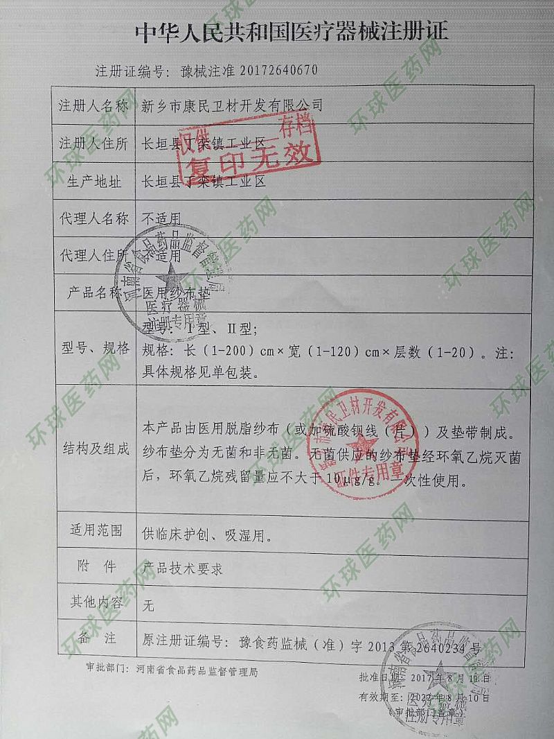 | 補(bǔ)充說明 | 醫(yī)用紗布棉墊(簡(jiǎn)稱棉墊)使用說明 名稱:醫(yī)用紗布棉墊(簡(jiǎn)稱棉墊) 包裝:滅菌、非滅菌 包材:紙塑袋(滅菌)、塑料袋(滅菌/非滅菌) 型號(hào):I型、II型(夾棉型) 規(guī)格:基本規(guī)格長(zhǎng)(1-200)cm×寬(1-120)cm×層數(shù)(1-20);具體規(guī)格20*30、20*20、30*40*4、40*40*4、20*30*4、20*30*2、30*30*2、30*40*2、40*40*2 注:具體規(guī)格見單包裝袋;也可根據(jù)需要定制。 組成:本產(chǎn)品由醫(yī)用脫脂紗布(或加硫酸鋇線(片))及墊帶制成。紗布?jí)|分為無菌和非無菌。無菌供應(yīng)的紗布?jí)|經(jīng)環(huán)氧乙烷滅菌后,環(huán)氧乙烷殘留量應(yīng)不大于10μg/g。 一次性使用。 適用:供臨床護(hù)創(chuàng)、吸濕用。 分類:顯影、不顯影 組成:本產(chǎn)品由醫(yī)用脫脂紗布切割折疊而成。 范圍:主要用于清潔皮膚、粘膜或創(chuàng)面,與創(chuàng)面護(hù)理常用藥物一起使用保護(hù)創(chuàng)面,也可用于手術(shù)過程中吸收體內(nèi)滲出液。 科室:適用于適用于手術(shù)室、產(chǎn)科、外科、內(nèi)科、ICU等各科室。 特點(diǎn):本產(chǎn)品100%純棉精制而成,柔軟、吸水性強(qiáng)、對(duì)皮膚***、無致敏性、******,具有可探測(cè)性,**術(shù)后的**性;本品醫(yī)用脫脂棉工藝處理,高溫煮漂處理,不只潔白,無熒光殘留,更有大吸液量,輕松吸液,潔凈傷口;無線頭機(jī)器自動(dòng)折疊,整齊均一,無紗頭紗線外露。 生產(chǎn)單位:新鄉(xiāng)市康民衛(wèi)材開發(fā)有限公司 生產(chǎn)地址:河南省長(zhǎng)垣縣丁欒工業(yè)園區(qū) 聯(lián)系電話:0373-8916668 移動(dòng)電話:18537300091 Email:kangminweicai@163.com |
