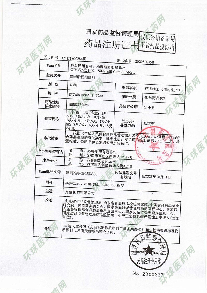 通用名稱: 枸櫞酸西地那非片