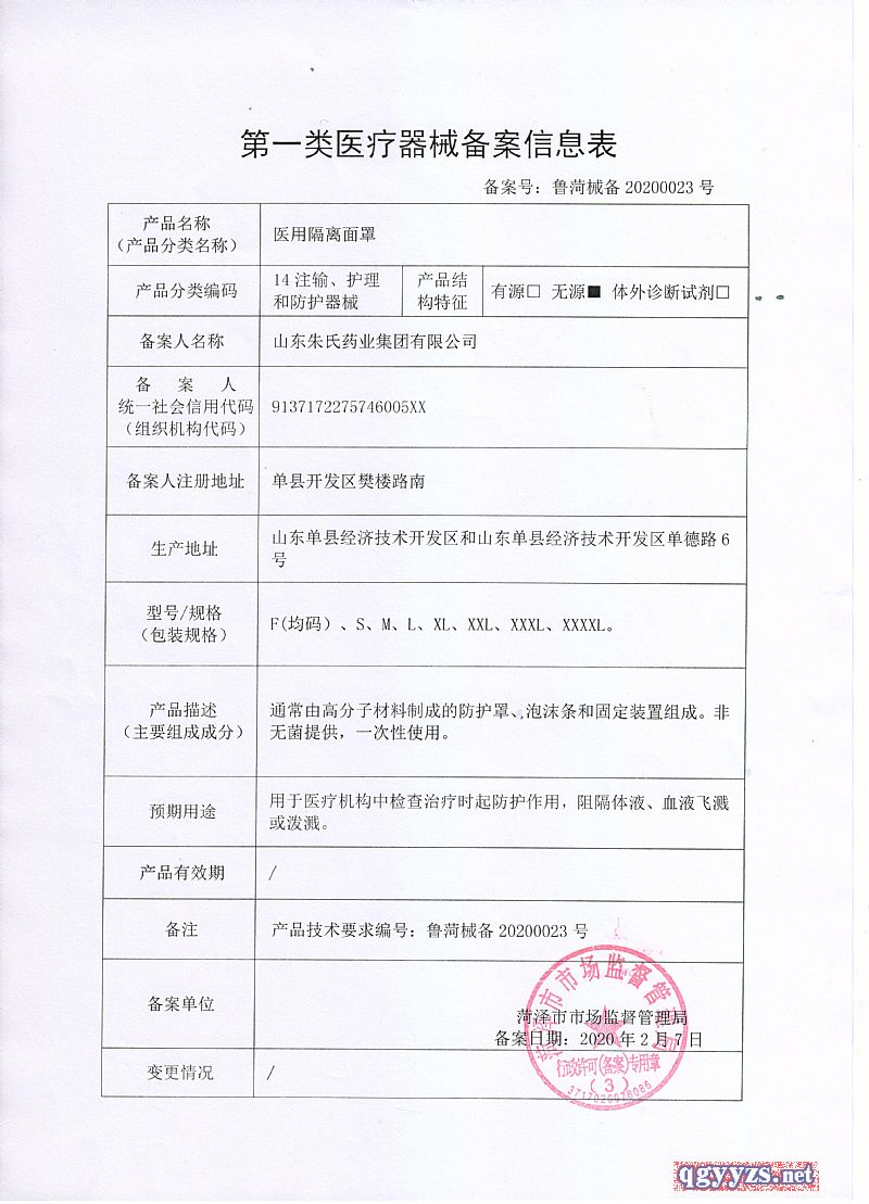 | 補充說明 | 【注意事項】1、如發(fā)現(xiàn)有破裂破損、不可使用。 2、如面罩表面有裂痕,不干凈,請更換。 3、注意佩戴密合性。 4、本品為銷毀。 【備案人名稱】山東朱氏藥業(yè)集團有限公司 【生產(chǎn)企業(yè)】山東朱氏藥業(yè)集團有限公司 【住 所】單縣開發(fā)區(qū)樊樓路南 【生產(chǎn)地址】山東單縣經(jīng)濟技術(shù)開發(fā)區(qū)和山東單縣經(jīng)濟技術(shù)開發(fā)區(qū)單德路6號 【售后服務(wù)機構(gòu)】山東朱氏藥業(yè)集團有限公一次性使用,使用后應(yīng)統(tǒng)一司 【生產(chǎn)日期】見單包裝 【使用期限】二年 |