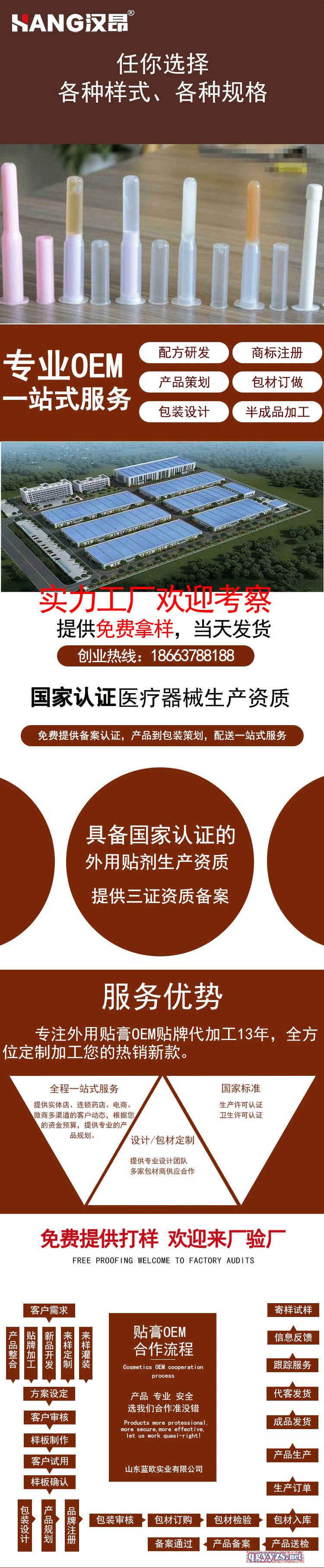 | 補充說明 | 膏藥生產(chǎn)源頭廠家OEM代加工招商加盟實力廠家代加工 OEM貼牌!代理!!**豐厚。! 創(chuàng)業(yè)熱線:左經(jīng)理:15965631743 貼膏廠家---山東漢昂藥業(yè)有限公司,承接各類貼膏貼劑OEM貼牌和代加工業(yè)務(wù) 1.自主品牌“益慈林”(底價代理、批發(fā),**豐厚) 2. 產(chǎn)品有:磁療貼、理療貼、冷敷貼等(貼牌加工、代理,**豐厚) 3.婦科產(chǎn)品有:暖宮貼、痛經(jīng)貼、乳腺貼等(貼牌加工、代理,**豐厚) 4.兒科產(chǎn)品有:腹瀉貼、感冒貼、止咳貼等(貼牌加工、代理,**豐厚) 藥監(jiān)局可查,幫你打造一款屬于您自己的合法產(chǎn)品。 產(chǎn)品、**空間大,歡迎來電洽談。 |