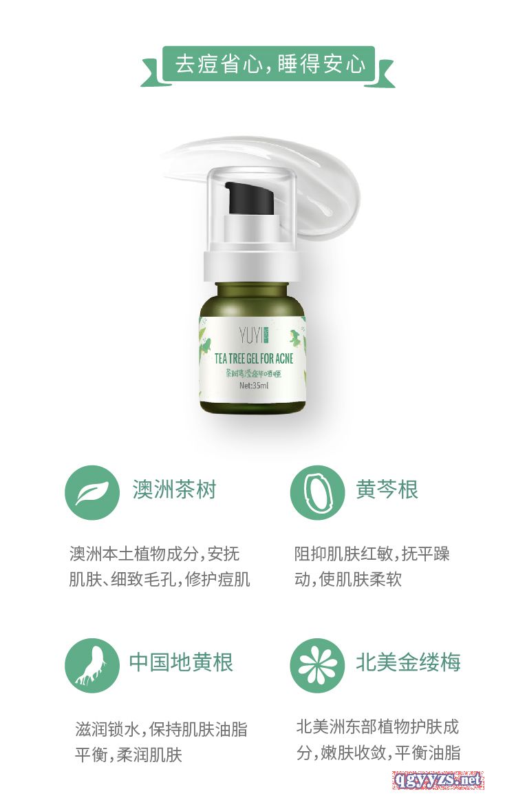 | 其它說明 | 萃取北美金縷梅提取物、黃檗提取物、白柳樹皮提取物、中國地黃根提取物、印度楝葉提取物、黃芩根提取物、魚腥草提取物、野大豆蛋白金釵石斛提取物、互生葉白千層(MELALEUCA ALTERNIFOLIA)葉油等植物精華成份,修護(hù)**痘痘肌,緩和肌膚,澳洲的土壤成就了佛系的茶樹。對肌膚的關(guān)懷無微不至,去肌熱,元?dú)鉂M滿,涼涼的觸感涂抹在有粉刺和痘痘的地方,舒適的體驗(yàn)感讓你從容應(yīng)對痘痘肌 |