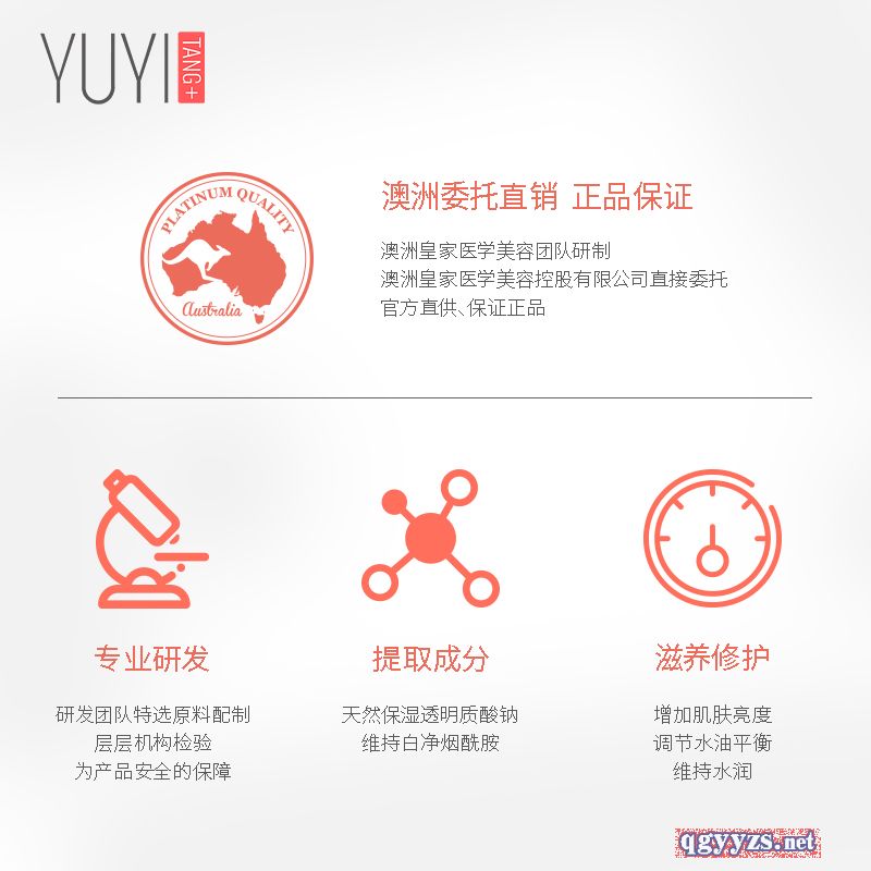 | 其它說(shuō)明 | 來(lái)自于澳洲**醫(yī)學(xué)美容團(tuán)隊(duì)研制,廣袤的澳洲大陸有著純凈無(wú)污染的地理生態(tài)資源,是護(hù)膚品重要原料來(lái)源的主要國(guó)家之一。由研發(fā)團(tuán)隊(duì)特選親膚溫和的原料配制,通過(guò)層層機(jī)構(gòu)檢驗(yàn),為YUYITANG產(chǎn)品提供有效的保障。 |