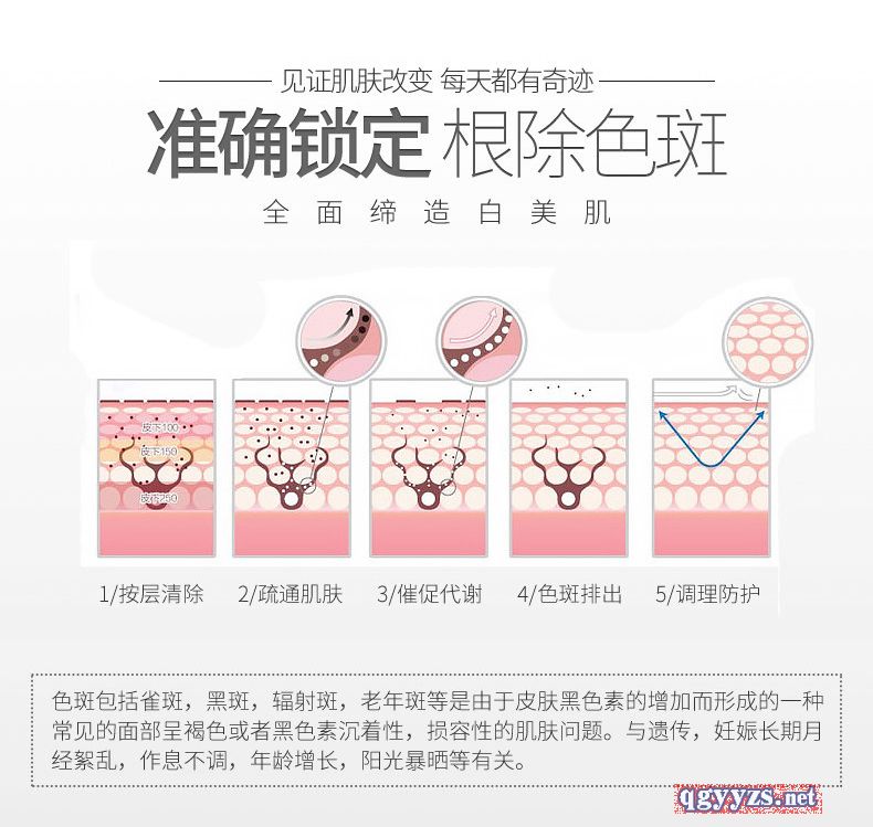 | 產(chǎn)品賣點(diǎn) | 其核心美白成分“熊果苷”,能夠通過抑制皮膚中酪氨酸酶的活性,阻止黑色素的形成,從而減少皮膚色素沉積,祛除色斑和雀斑,美白肌膚,迅速滲透肌膚基底層,分解沉積黑色素而不傷肌膚,肌膚表面的色斑逐漸淡化 |