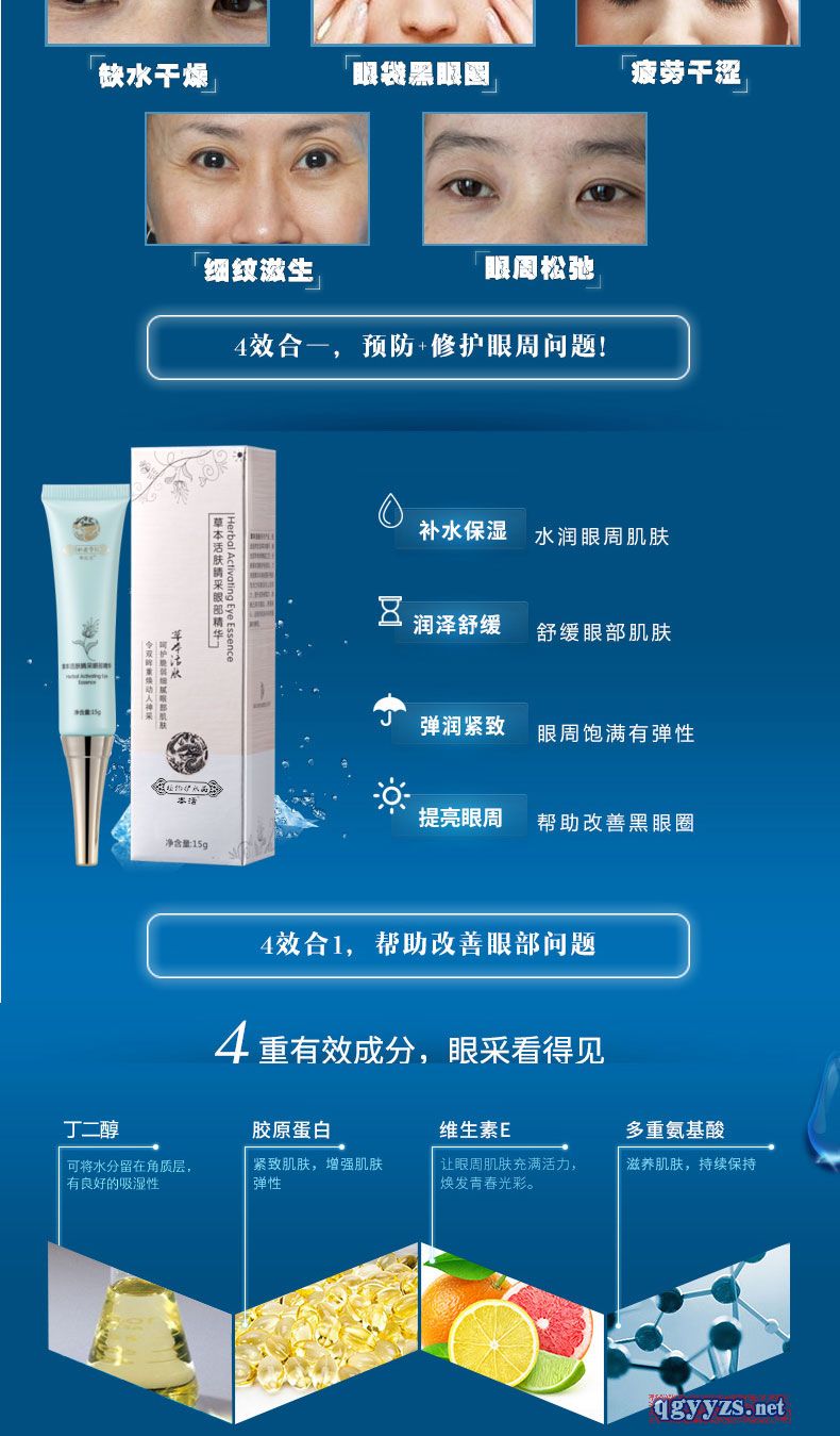 | 產(chǎn)品賣點 | 草本溫和配方,眼周肌膚如獲新生,感覺飽滿緊實舒緩柔滑,雙眸更加明亮有神采 |